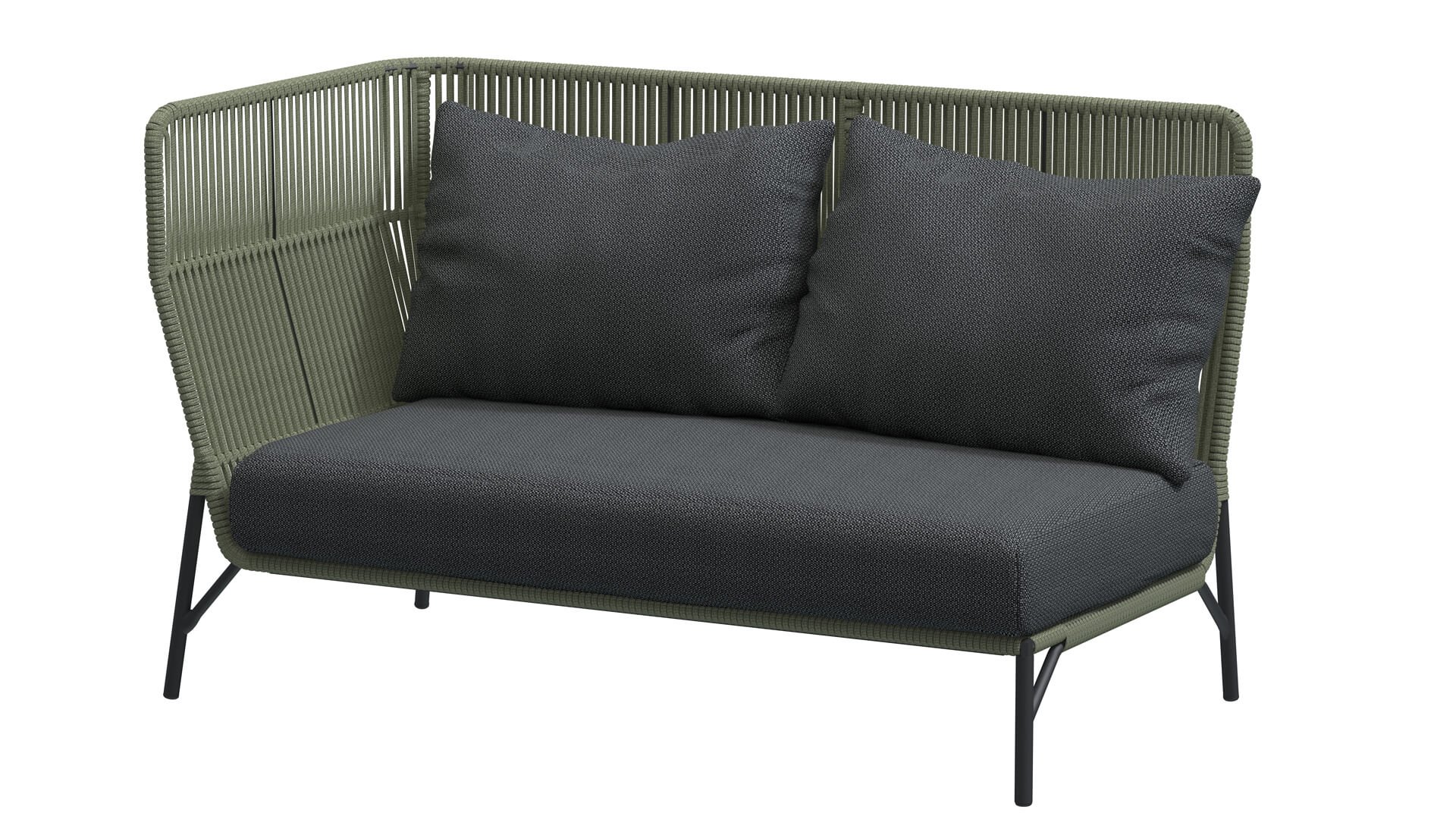Das modulare 4SO Altoro Lounge-Set sieht aufgrund seiner extra hohen Rückenlehne wunderschön aus und vermittelt ein sicheres und gemütliches Gefühl. Das Altoro Lounge-Set ist mit einem grünen Rope versehen, das einen schönen Kontrast zum dunklen anthrazitfarbenen Rahmen und den Kissen bildet.