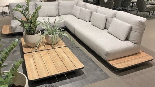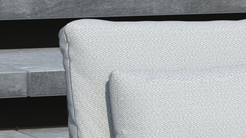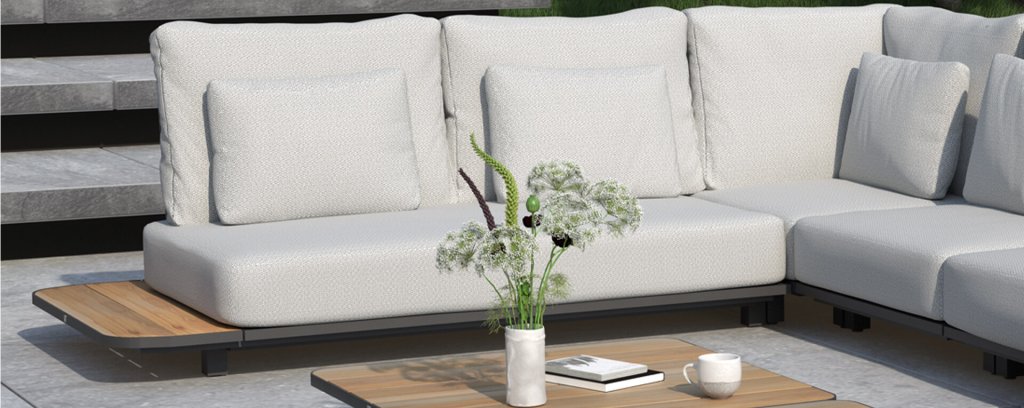 Das Arcade Lounge Set ist modular aufgebaut und Sie können Ihr ideales Set selbst zusammenstellen. Das Zwischenmodul erleichtert das Erweitern des Sets, das spiegelbildliche Platzieren und für einen kompakten Raum können Sie auch eine kleinere Größe wählen. Sie können das Ecksofa auch mit zwei Couchtischen kombinieren, die zusätzlichen Platz für einen Snack und ein Getränk oder eine schöne Dekoration bieten, die Ihr Lounge-Set vervollständigt. Da die Beine dieser Lounge tiefer unter dem Sofa liegen, scheint es, als ob dieses Loungesofa zu schweben scheint. Dies gibt einen schönen Blick auf eine elegante moderne Terrasse.