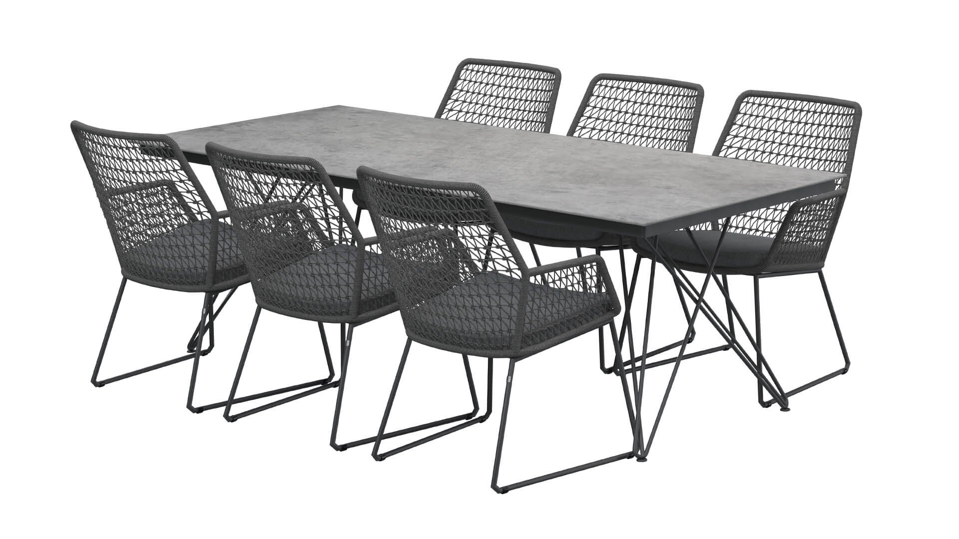 Mit der 4SO Babilonia Dining Collection können Sie Gartenmöbel in vollen Zügen genießen. Sie zeigen ein außergewöhnliches Design und sind handgefertigt. Geknotetes Seil und subtile Rahmen, die zusammenwirken, sorgen für fantastischen Komfort. Die Aluminiumbasis hat die sog. "Schlittenbein"-Form, die in Kombination mit dem schönen hellbraunen Geflecht einen modernen und dennoch "warmen" Look ergibt. Die runden Formen halten dieses Design vollkommen im Gleichgewicht.
