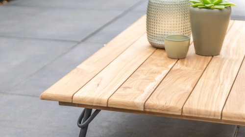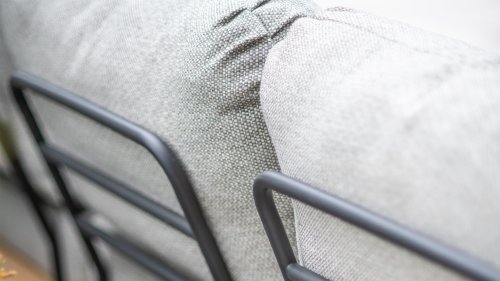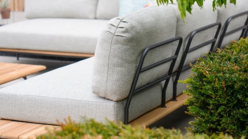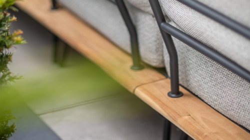 Das elegante Gestell von 4SO Cucina wird aus hochqualitativem anthrazit farbigen Edelstahl hergestellt, das den Möbeln eine authentische Ausstrahlung verleiht. Das Rahmendesign besticht durch seine durchlaufenden designer Kurven. Die voluminösen Kissen aus Olefin-Stoff sind wetterbeständig. Der Stoff wirkt durch seine juteähnliche Optik ausgesprochen robust, die Kombination mit dem Teakholz ist ein echter Eye-Catcher!