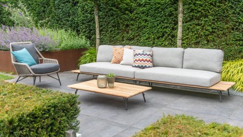 4 Seasons Outdoor Cucina Loungeset: Robuste Teakholz Balken mit designer Gestell, zusammen geschmolzen in einem Stück zu einem zeitlosen Lounge Möbelstück.Wir lieben Natur Wir lieben Teak-Holz und wir lieben FSC® und SVLK® Darum sind alle unsere 4 Seasonsoutdoor Hölzer zertifiziert. Die Semi-All Weather Kissen sind einzigartig! Dank der Verwendung verschiedener Kissenfüllungen in Rücken- und Sitzkissen ergibt sich den besten Sitzkomfort.
