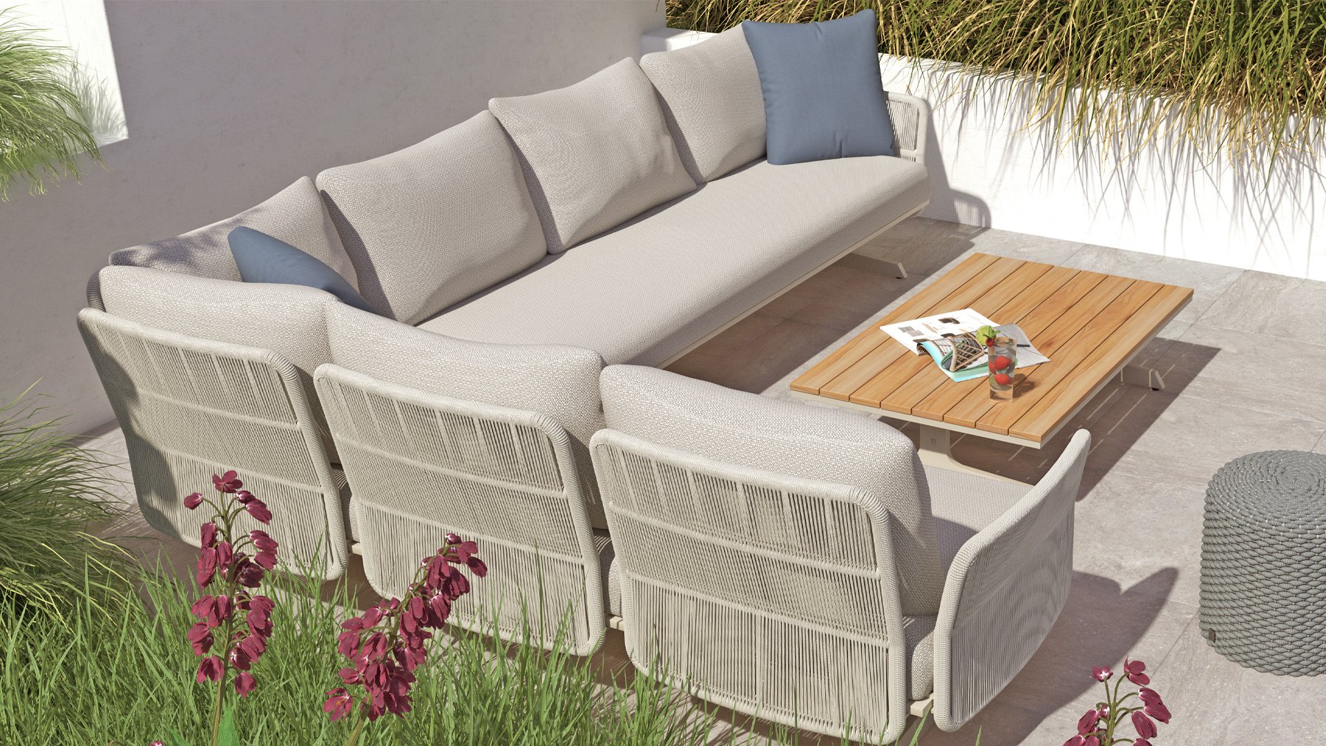 | Materialien Loungegruppe | Rope, Pulverbeschichtet Aluminium/Stahl |