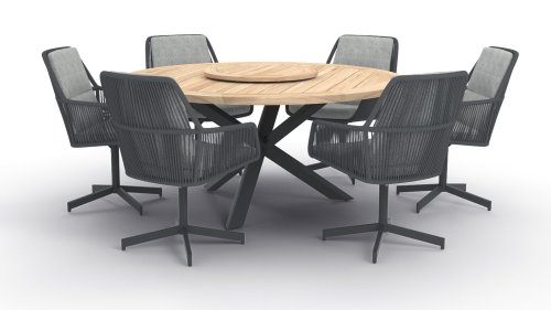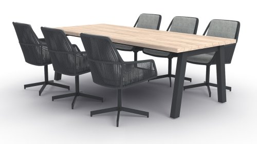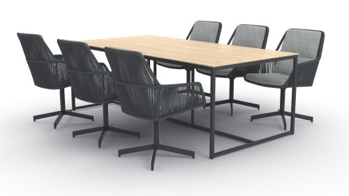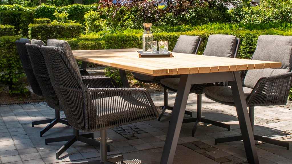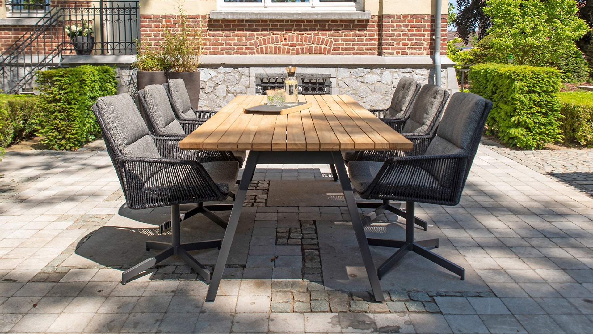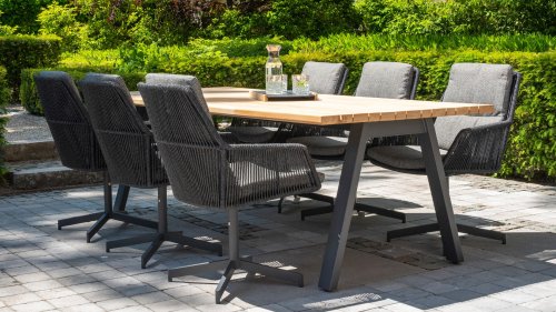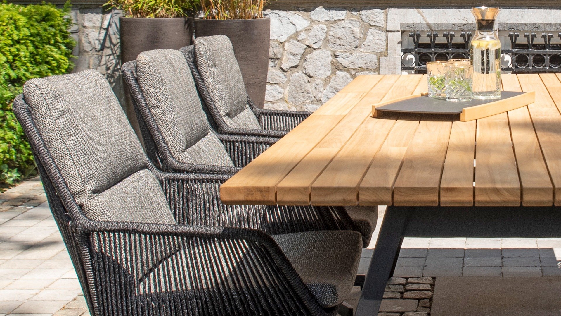 Das 4Seasons Primavera Gartenset hat einen modernen Look mit einer natürlichen Note, die so charakteristisch für das Design ist. Die Schönheit liegt im Detail. Das Gestell des 4Seasons Primavera Esszimmerstuhls läuft fließend und fließend ineinander über und wird mit dem eng geflochtenen Seil abgeschlossen. Rückenlehne und Sitzfläche sind mit diesem starken Seil geflochten und geben einen festen, aber bequemen Sitz. Der Rahmen bildet ein spielerisches und minimalistisches Wechselspiel fließender Linien, die sich treffen und wieder trennen. Die Seiten und der Rücken sind mit kunstvoll geflochtenem Seil versehen, wodurch ein glattes, aber ruhiges Ganzes entsteht, kurz gesagt, eine Augenweide!