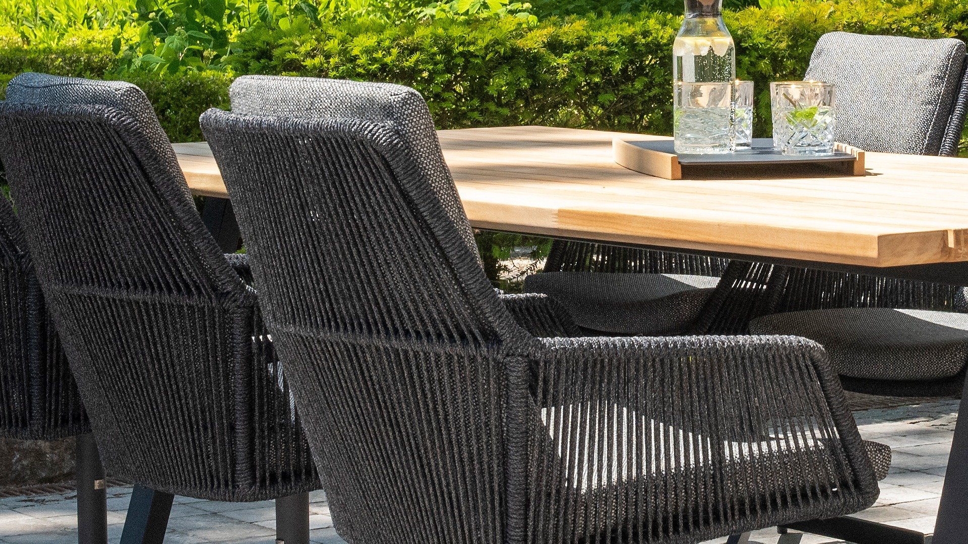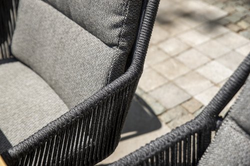 Das 4Seasons Primavera-Gestell ist mit anthrazitfarbenem Kunstgeflecht in Seilform (Rope) geflochten. Die Kissen sind aus einem schönen anthrazitfarbenen oder grauen Olefin-Stoff. Die Widerstandsfähigkeit des Rope-Materials und die wunderbaren Sitz- und Rückenkissen schaffen einen großartigen Sitzkomfort! Die Kissen haben einen Olefin-Bezug, der abgenommen und bei 30 Grad gewaschen werden kann. Dieser Stoff ist sehr witterungsbeständig und strapazierfähig.