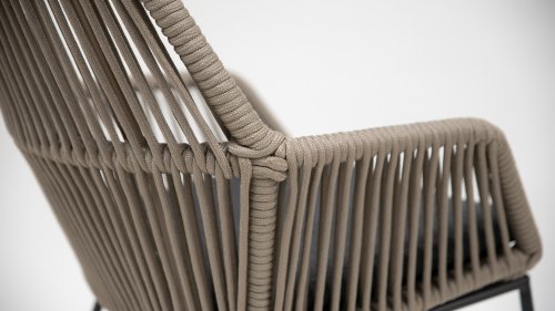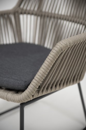 Der minimalistische Rahmen ist aus Aluminium und das Untergestell ist aus Anthrazit farbig pulverbeschichtet Edelstahl hergestellt, so dass Festigkeit und lebensdauer es mehr als ausreichend behaupt sind. Die bequeme anthrazit farbigen Kissen, zusammen mit der Taupe Rope Geflecht gibt dies eine Harmonie von Farben mit Atmosphäre, die perfekt zu jedem Garten passt.