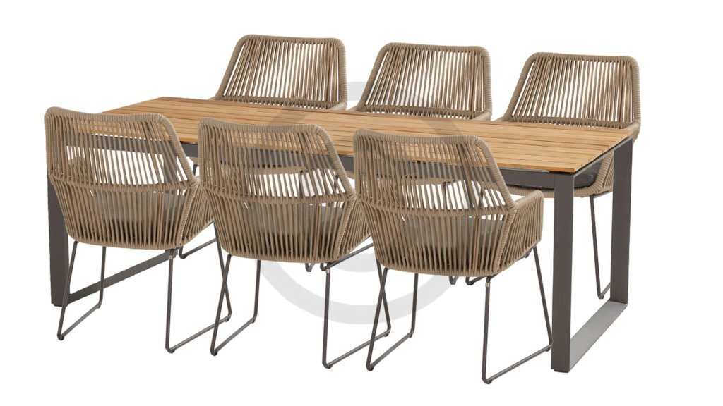Das 4 Seasons Ramblas wurde mit viel Liebe zum Detail gestaltet. Anthrazitfarbene Kissen, die die natürliche braune Farbe der Ramblas schön zur Geltung bringen. Fließendes gewebtes Seil schafft eine einladende Sitzgelegenheit, die an einem stabilen anthrazitfarbenen Rahmen befestigt ist. Die Widerstandsfähigkeit des Rope-Materials und die dicken Kissen schaffen einen großartigen Sitzkomfort. Die Kissen haben einen Olefin-Bezug, der abgenommen und bei 30 Grad gewaschen werden kann. Dieser Stoff ist sehr witterungsbeständig und strapazierfähig. Speisen Sie stilvoll mit Ramblas!