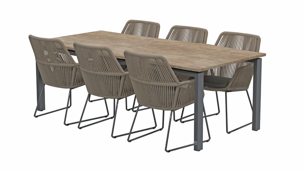 Das 4 Seasons Ramblas wurde mit viel Liebe zum Detail gestaltet. Anthrazitfarbene Kissen, die die natürliche braune Farbe der Ramblas schön zur Geltung bringen. Fließendes gewebtes Seil schafft eine einladende Sitzgelegenheit, die an einem stabilen anthrazitfarbenen Rahmen befestigt ist. Die Widerstandsfähigkeit des Rope-Materials und die dicken Kissen schaffen einen großartigen Sitzkomfort. Die Kissen haben einen Olefin-Bezug, der abgenommen und bei 30 Grad gewaschen werden kann. Dieser Stoff ist sehr witterungsbeständig und strapazierfähig. Speisen Sie stilvoll mit Ramblas!