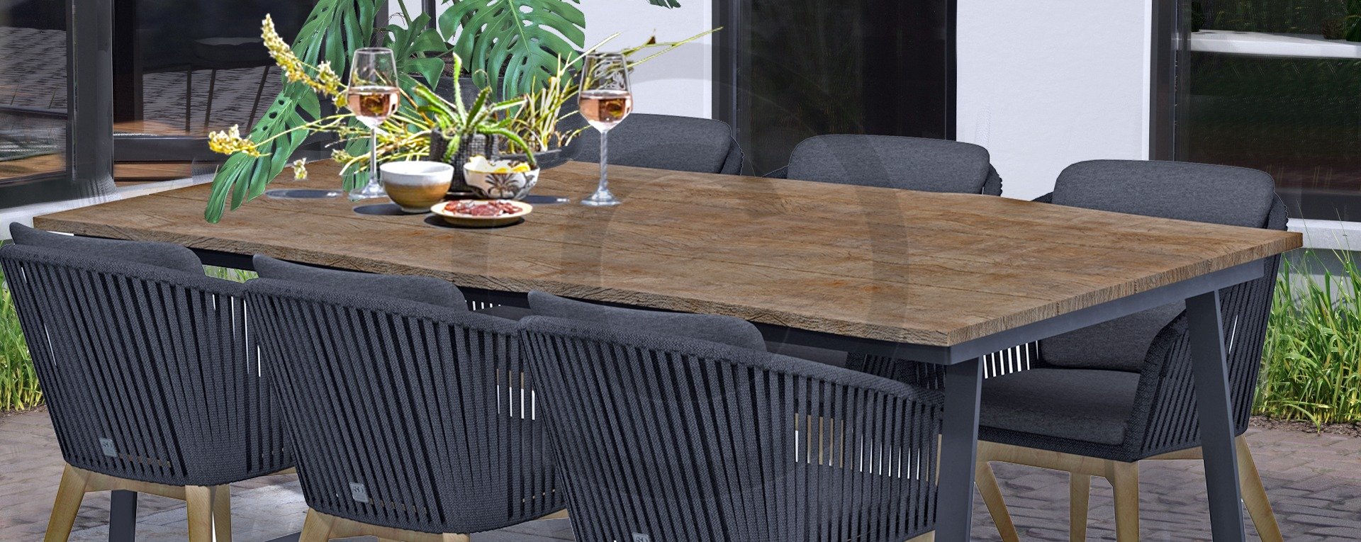 Die 4Season Santander Dining ist verfügbar in 2 Farben: Mid Grey mit Instant Grey Teak und Black mit Natural Teak.