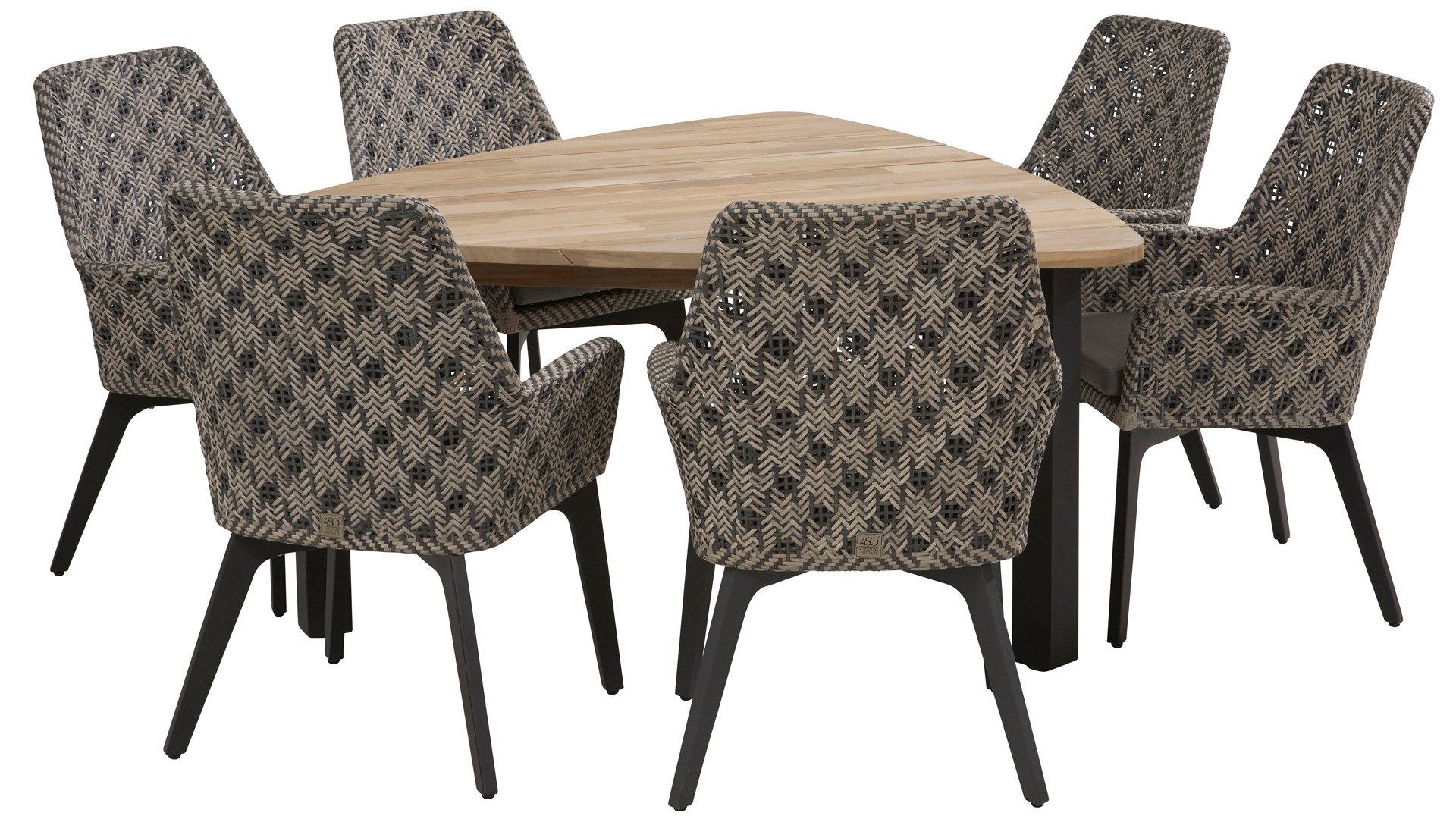 4Seasons Savoy Dining: 4 Seasons Outdoor Savoy ist eine Serie von Gartenmöbeln mit außergewöhnlichen Eigenschaften und exzentrischem Aussehen. Die Flechtspezialisten von 4 Seasons sind in der Lage, ein spezielles Muster in 2 Farben zu verarbeiten. Savoy ist ein Stück Handarbeit von erfahrenen Webern. Das Muster ist ein wahres Puzzle und das Design dieser Gartenmöbel hat einen skandinavischen Touch.