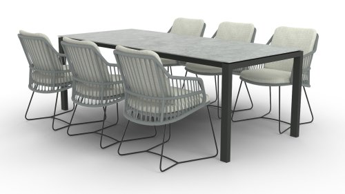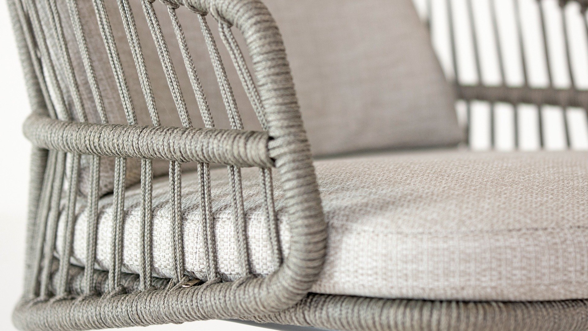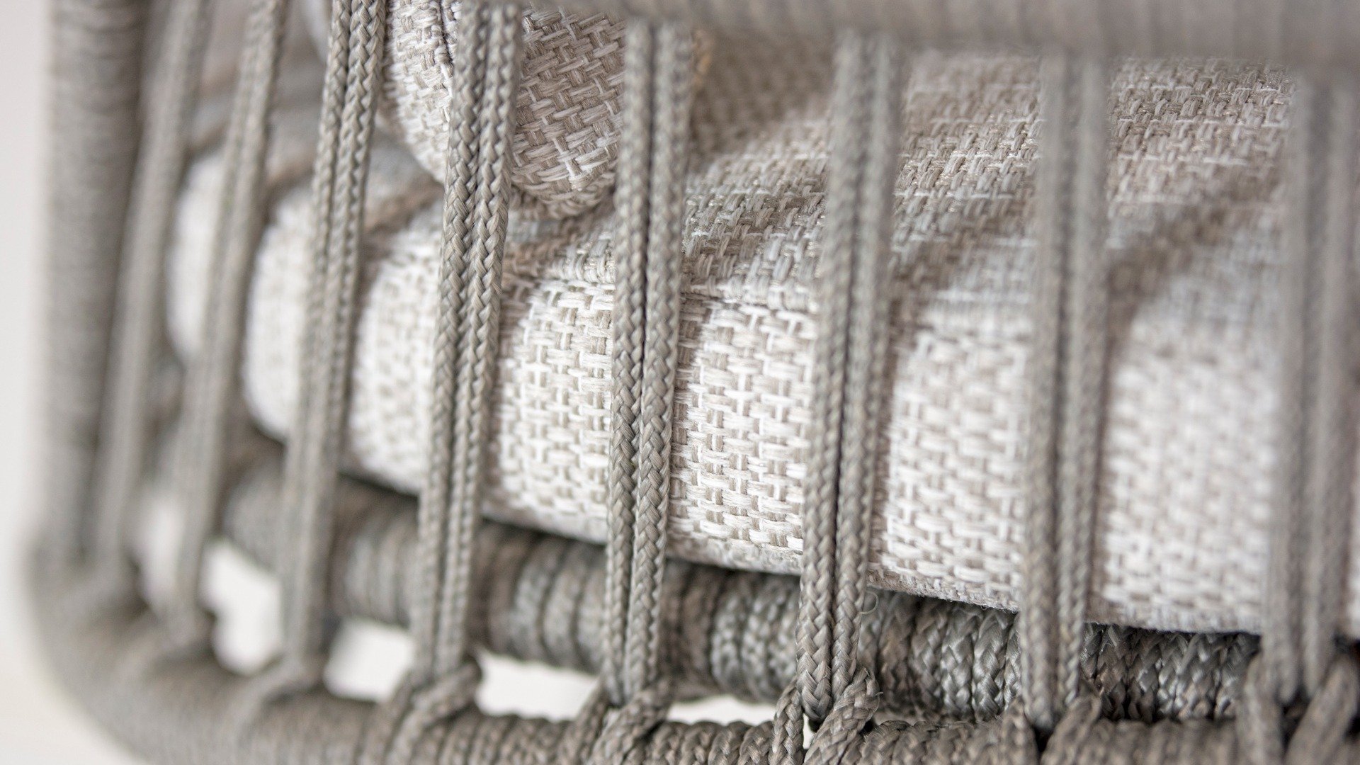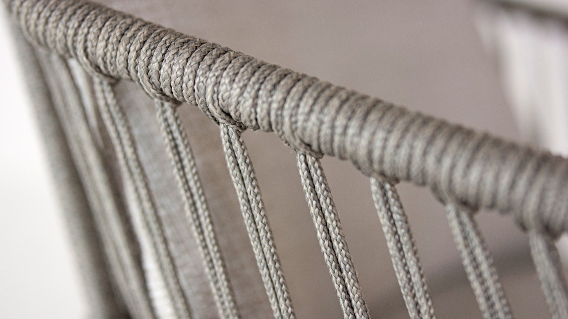 In unserer 4Seasons Outdoor Sempre Serie sind die Gartenmöbel minimalistisch im Design mit funktionaler Schlichtheit und elegantem Design. Die schönen Rahmen sind aus Aluminium und die Beinen sind aus Edelstahl und haben eine anthrazit farbigen Pulverbeschichtung. Der Rahmen der 4SO Sempre Esstisch-Set fließen in einander und dies wird fertiggemacht mit dem einzigartige Rope Geflechte. Ein schönes, flaches Seil (Rope) mit einem weichen und komfortablen Aussehen wurde in den Rahmen Kreuzweise eingewebt. Die runden Formen erhalten das Gleichgewicht dieses modernen Designs. Der Rahmen ist eine spielerische und zerbrechlich Zusammenspiel von glatten Linien, die wieder zusammen kommen und auseinander gehen, Die Seiten und der Rücken sind mit kunstvoll gekreuzten Rope Seilen abgeschlossen, wodurch ein verspieltes verknotet Rautenmuster entsteht... Ein fest für die Augen!