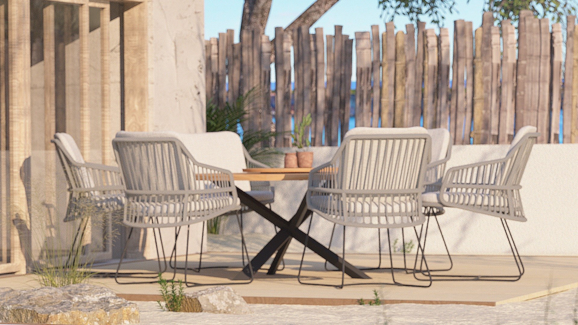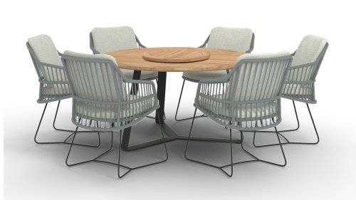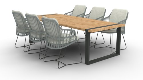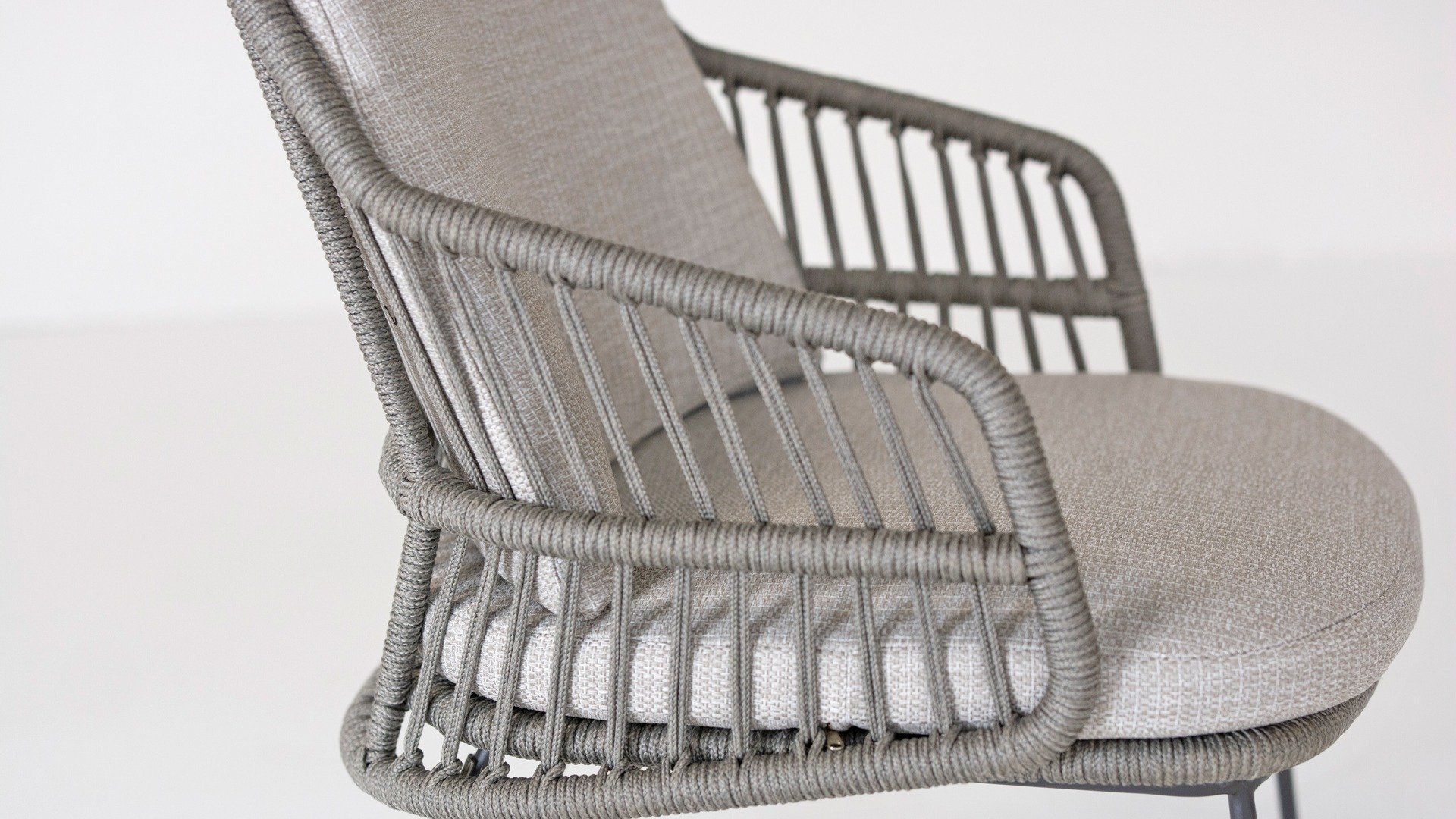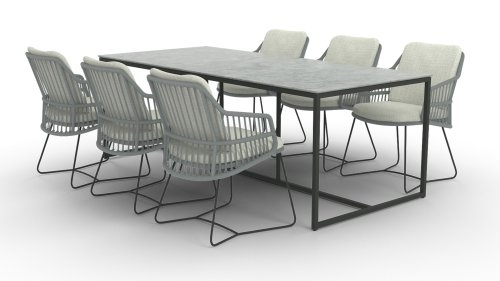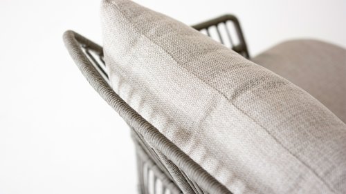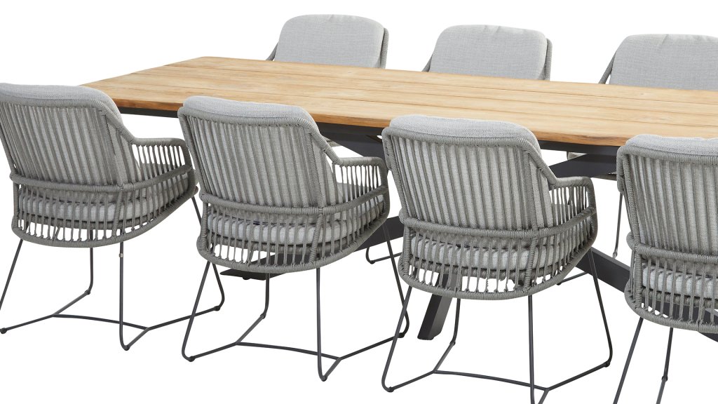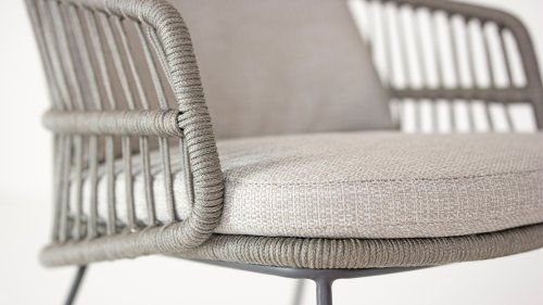 In unserer 4Seasons Outdoor Sempre Serie sind die Gartenmöbel minimalistisch im Design mit funktionaler Schlichtheit und elegantem Design. Die schönen Rahmen sind aus Aluminium und die Beinen sind aus Edelstahl und haben eine anthrazit farbigen Pulverbeschichtung. Der Rahmen der 4SO Sempre Esstisch-Set fließen in einander und dies wird fertiggemacht mit dem einzigartige Rope Geflechte. Ein schönes, flaches Seil (Rope) mit einem weichen und komfortablen Aussehen wurde in den Rahmen Kreuzweise eingewebt. Die runden Formen erhalten das Gleichgewicht dieses modernen Designs. Der Rahmen ist eine spielerische und zerbrechlich Zusammenspiel von glatten Linien, die wieder zusammen kommen und auseinander gehen, Die Seiten und der Rücken sind mit kunstvoll gekreuzten Rope Seilen abgeschlossen, wodurch ein verspieltes verknotet Rautenmuster entsteht... Ein fest für die Augen!