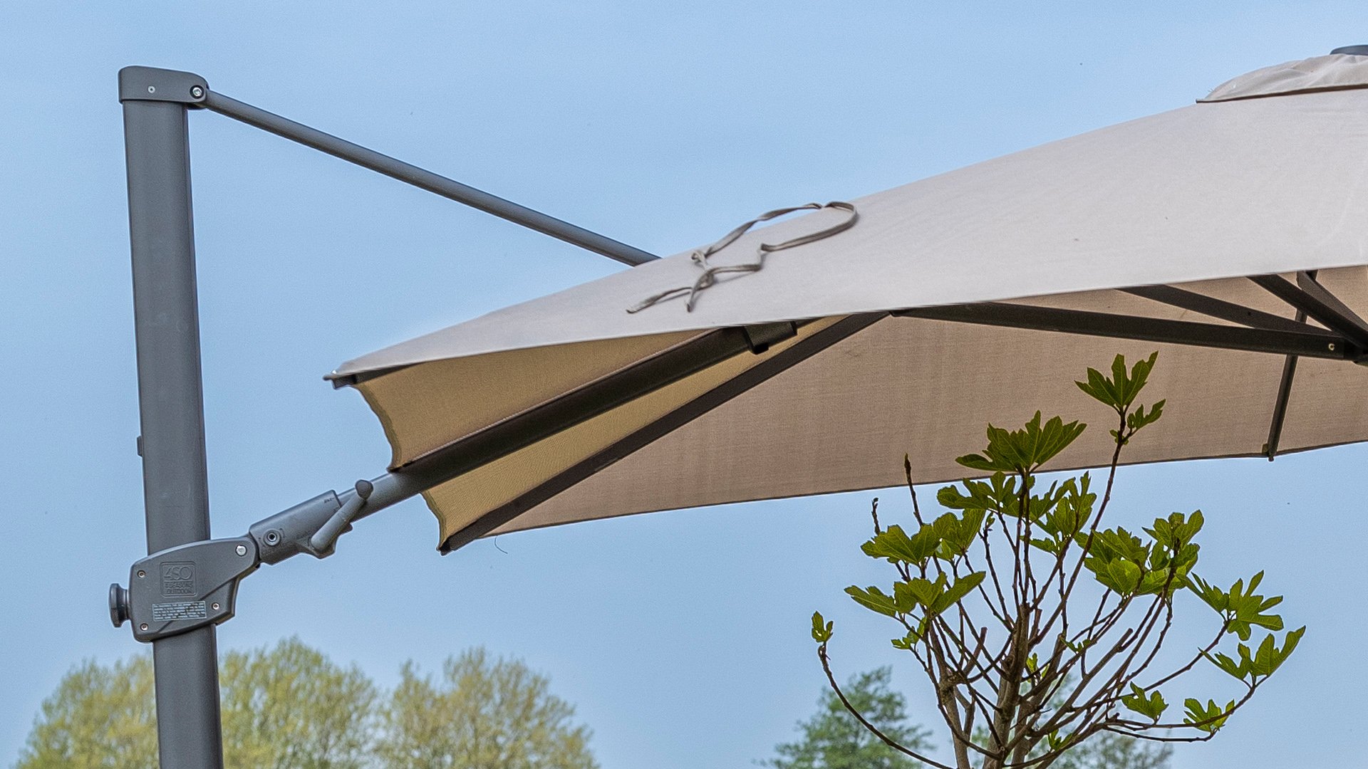 Jeder 4Seasons Outdoor Hängearmschirm kann sich auf der Basis drehen und nach hinten neigen, um die tiefstehende Sonne einzufangen.