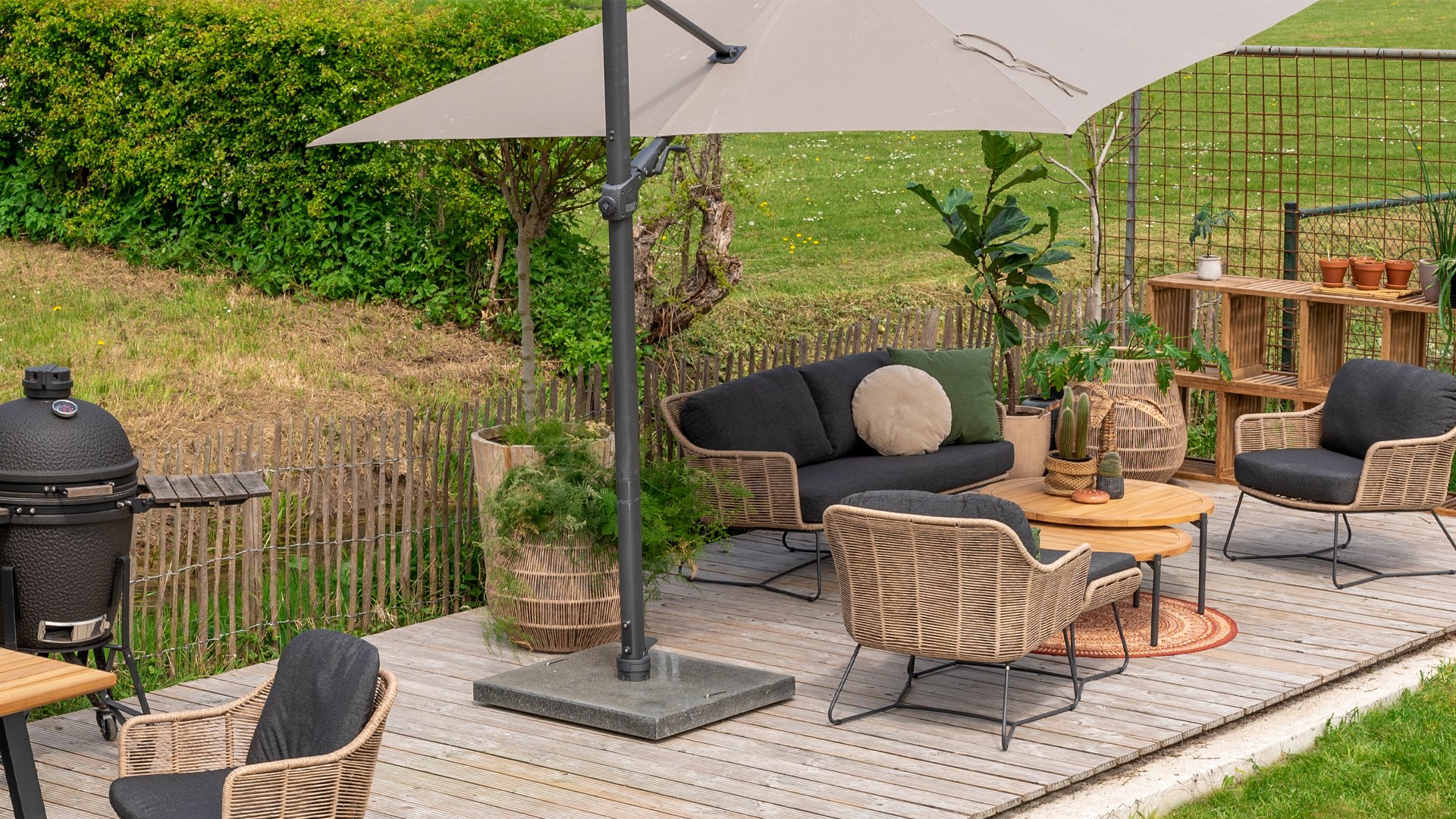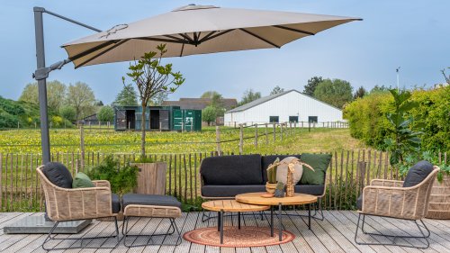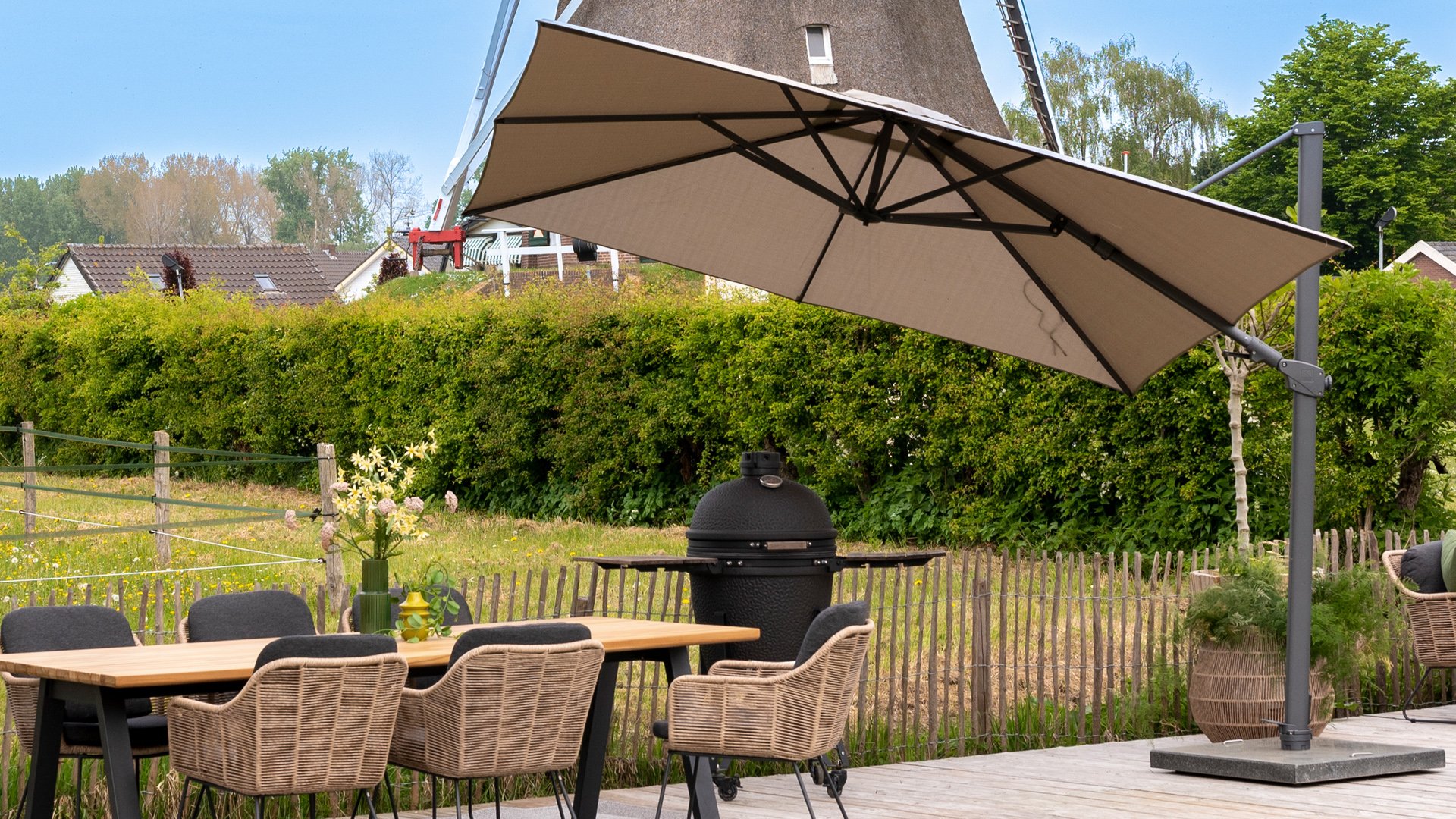 Wenn Sie Räder hinzufügen, kann der Sonnenschirm auch auf Ihrer Terrasse bewegt werden.