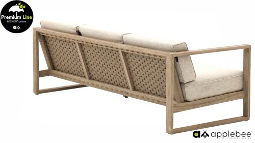 Das wunderschöne Design des Applebee Antigua Loungeset basiert sich hauptsächlich auf eckigen, kubistischen Formen, was diesem Set einen so schönen, schlanken Charakter verleiht. Sowohl das Loungeset als auch der Tisch bestehen aus Teakholz mit coastal finish, was ihm ein leichtes Aussehen verleiht. Der Sitz und die Rückenlehne bestehen aus Korbwaren aus 'Gürtel und Seil' in der Farbe Taupe.