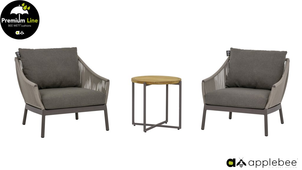 Die stromlinienförmige Bijou Lounge von Applebee zeichnet sich durch das zweilagige geflochtene Seil aus, durch das man hindurchsehen kann. Um den Aluminiumrahmen herum lässt das Drahtseil die Ecken offen, so dass die Farbe Taupe zum Vorschein kommt. Die feinen, geschwungenen Konturen dieses Möbelstücks sorgen für ein schlichtes, aber elegantes Aussehen. In Kombination mit dem harmonischen Zusammenspiel der Taupefarben und des Geflechts ist der luxuriöse Bijou eine wunderbare Ergänzung für den Garten. Natürlich ist auch dieses Lounge-Set mit unseren Bee Wett®-Kissen ausgestattet.