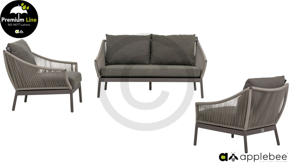 Die stromlinienförmige Bijou Lounge von Applebee zeichnet sich durch das zweilagige geflochtene Seil aus, durch das man hindurchsehen kann. Um den Aluminiumrahmen herum lässt das Drahtseil die Ecken offen, so dass die Farbe Taupe zum Vorschein kommt. Die feinen, geschwungenen Konturen dieses Möbelstücks sorgen für ein schlichtes, aber elegantes Aussehen. In Kombination mit dem harmonischen Zusammenspiel der Taupefarben und des Geflechts ist der luxuriöse Bijou eine wunderbare Ergänzung für den Garten. Natürlich ist auch dieses Lounge-Set mit unseren Bee Wett®-Kissen ausgestattet.