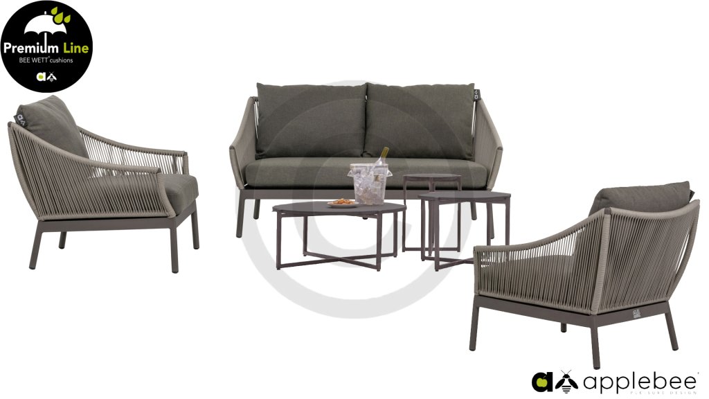 Die stromlinienförmige Bijou Lounge von Applebee zeichnet sich durch das zweilagige geflochtene Seil aus, durch das man hindurchsehen kann. Um den Aluminiumrahmen herum lässt das Drahtseil die Ecken offen, so dass die Farbe Taupe zum Vorschein kommt. Die feinen, geschwungenen Konturen dieses Möbelstücks sorgen für ein schlichtes, aber elegantes Aussehen. In Kombination mit dem harmonischen Zusammenspiel der Taupefarben und des Geflechts ist der luxuriöse Bijou eine wunderbare Ergänzung für den Garten. Natürlich ist auch dieses Lounge-Set mit unseren Bee Wett®-Kissen ausgestattet.