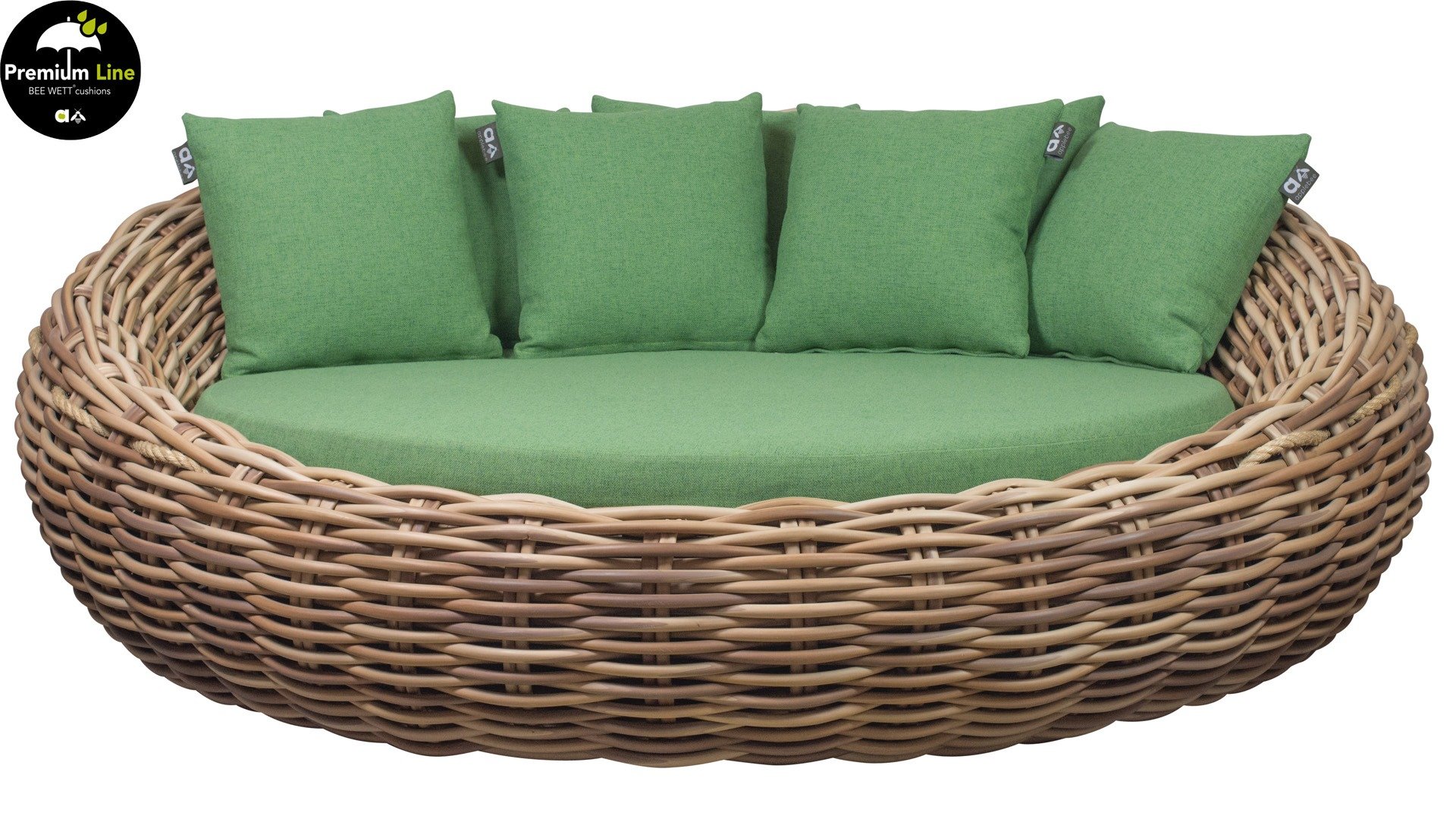 Inspiriert durch den sicheren Kokon, in dem sich eine Raupe geborgen fühlt und sich in einen wunderschönen Schmetterling verwandelt. Wunderschöne grüne Loungekissen – optional mit Bee-Wett®-Technologie – in Kombination mit dem außergewöhnlich dicken geflochtenen Biculair®-Flechtfaden in 20mm Stärke. Der Applebee Cocoon ist buchstäblich der Evergreen von Apple Bee!
