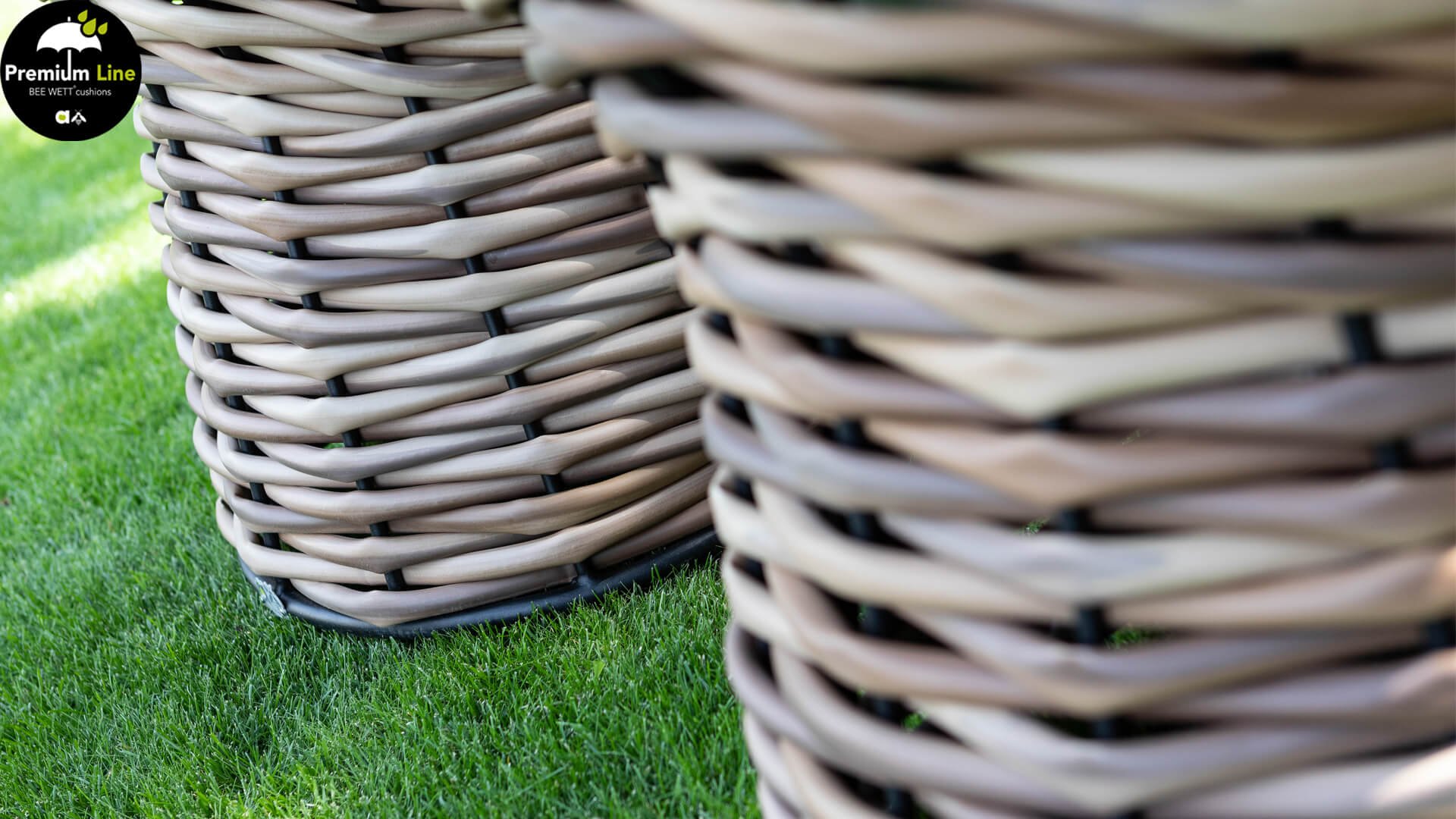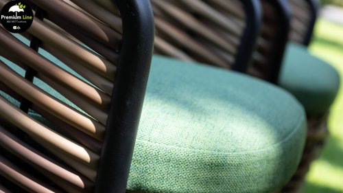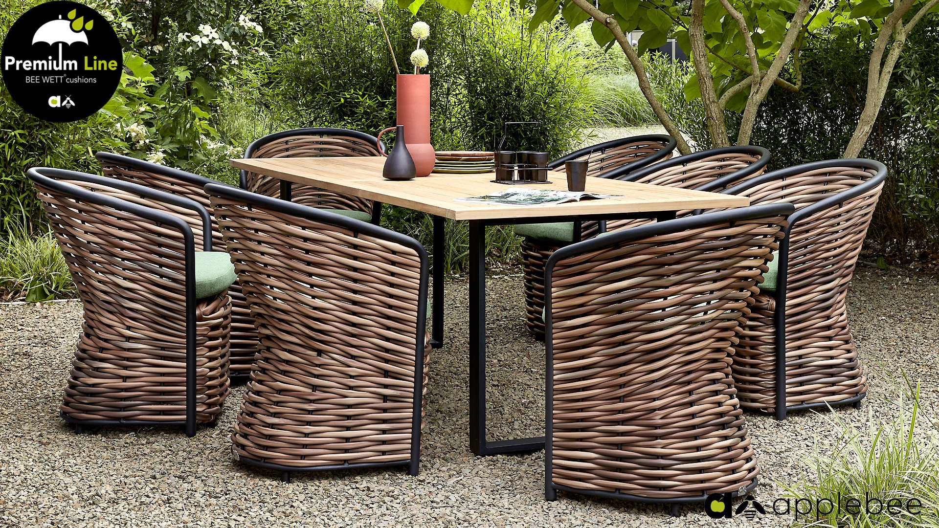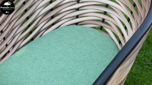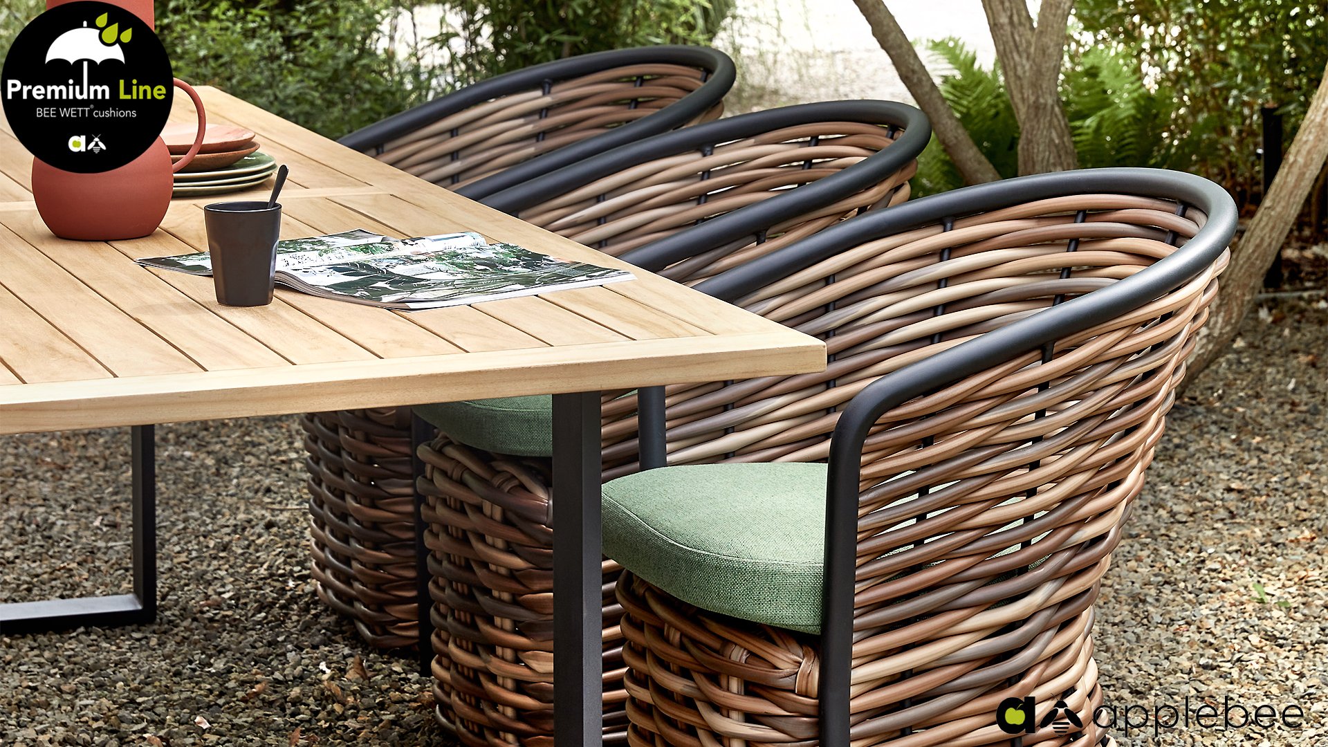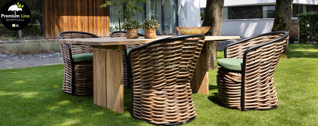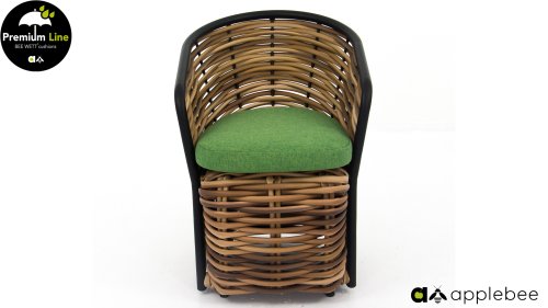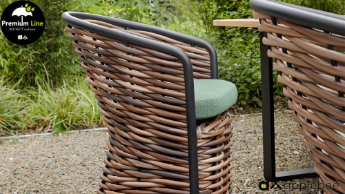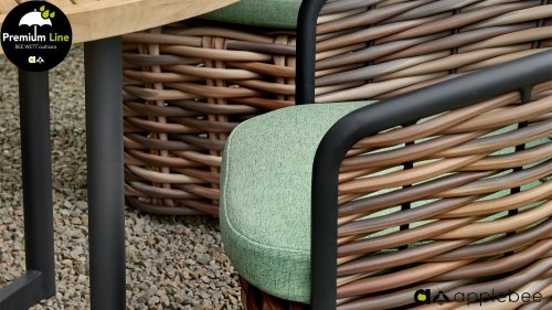 AppleBee Cocoon Dining: Genuss in einer absolut zeitgemäßen Jacke, schöne runde Formen, in denen Genuss eine neue Bedeutung bekommt! Die Cocoon-Serie vermittelt eine natürliche Atmosphäre, aufgrund der Farbkombination aus Mocca-Flechtfaden, Rahmen in mattschwarz und grünen Kissen, die die bekannten Beewett-Kissen von AppleBee für wunderbaren Bedienkomfort bieten.