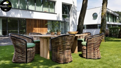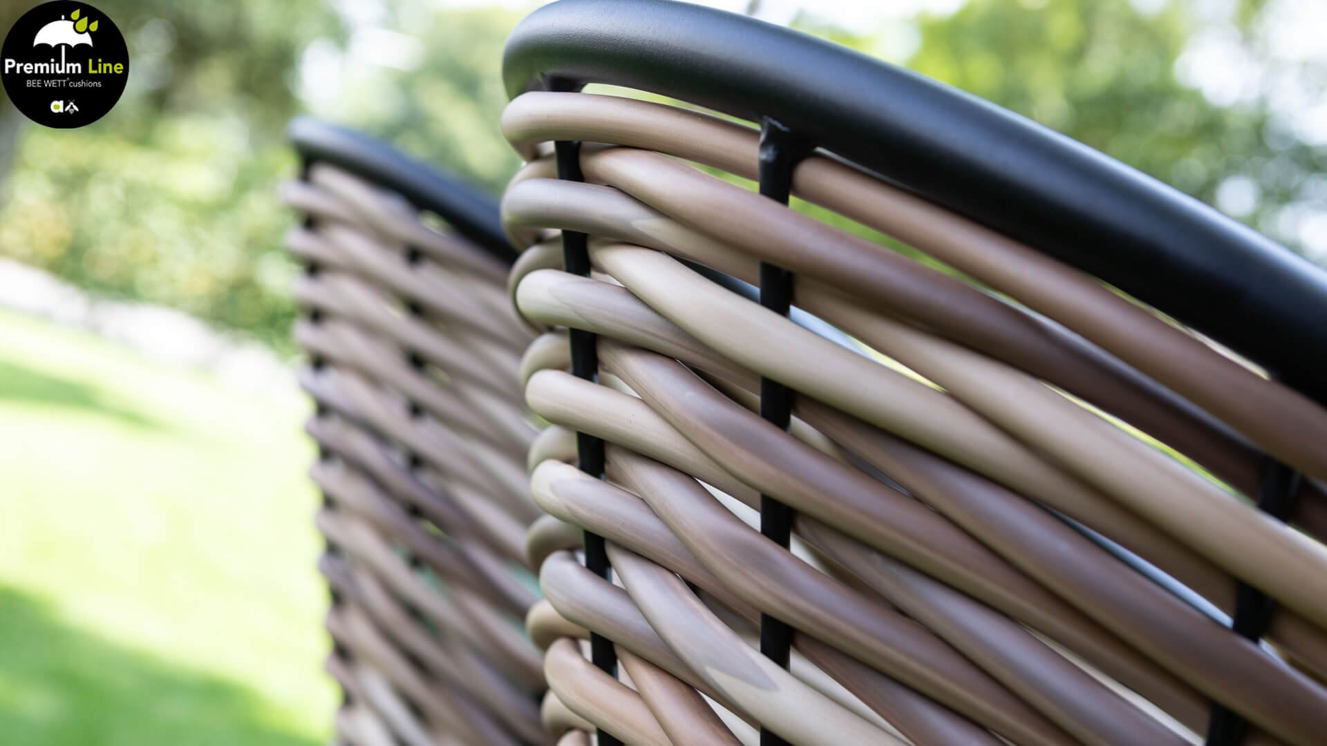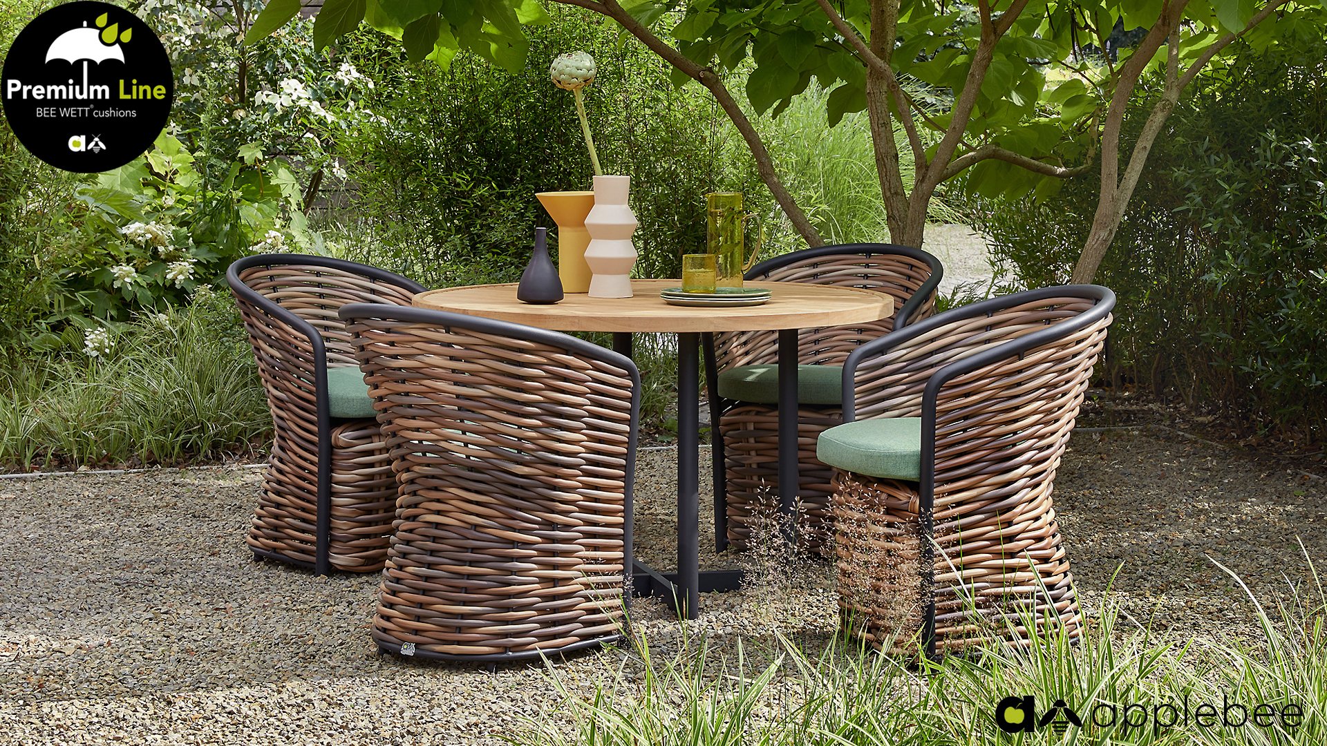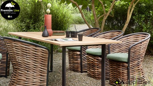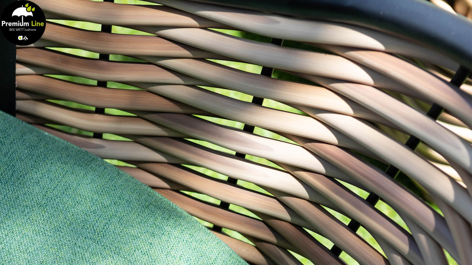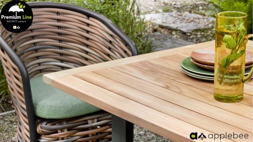 AppleBee Cocoon Dining: Genuss in einer absolut zeitgemäßen Jacke, schöne runde Formen, in denen Genuss eine neue Bedeutung bekommt! Die Cocoon-Serie vermittelt eine natürliche Atmosphäre, aufgrund der Farbkombination aus Mocca-Flechtfaden, Rahmen in mattschwarz und grünen Kissen, die die bekannten Beewett-Kissen von AppleBee für wunderbaren Bedienkomfort bieten.