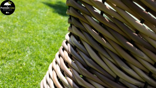Der 20mm dicke Mocca Flechtfaden wird von Hand und mit großem Aufwand fest um den Aluminiumrahmen geflochten. Apple Bee hat sich diese raffinierte Flechttechnik durch jahrelange Erfahrung und die Zusammenarbeit mit den erfahrensten Flechtexperten angeeignet. Der Designer will mit dem neuen Flechtfaden die Idee von geflochtenen Rattanstäben vermitteln.