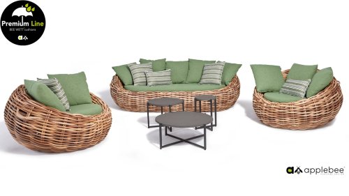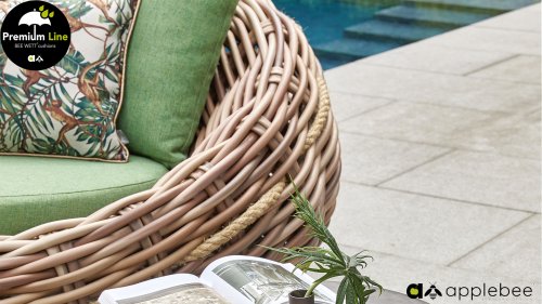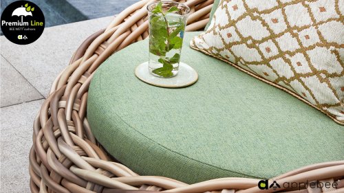 Das Comeback! Nicht umsonst wurde der Applebee Cocoon Loungegruppe wieder in die Kollektion von Apple Bee aufgenommen, und diesmal in einem hochmodernen Look. Er ist noch immer inspiriert durch den sicheren Kokon, in dem sich eine Raupe geborgen fühlt und sich in einen wunderschönen Schmetterling verwandelt. Wunderschöne grüne Loungekissen mit Bee-Wett®-Technologie in Kombination mit dem außergewöhnlich dicken geflochtenen Biculair®-Flechtfaden in 20mm Stärke. Immer noch in der typischen runden Form, die Sako Wijma beim ersten Cocoon-Design so schön umzusetzen wusste. Ihr eigenes, geborgenes Fleckchen im Garten oder auf der Terrasse. Ein gute Kombination mit denn Applebee Cocoon dining!