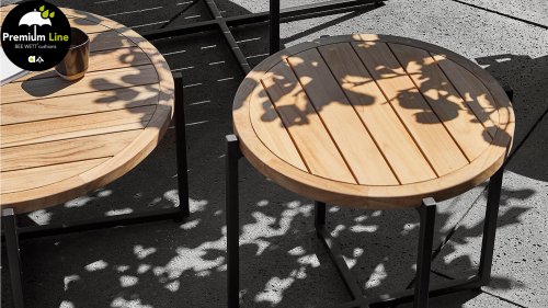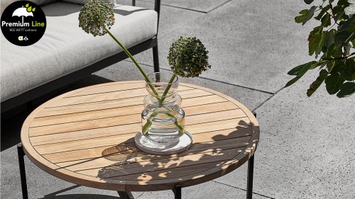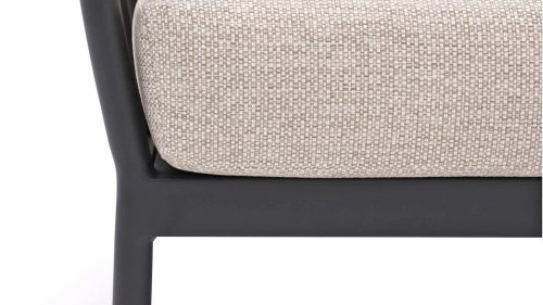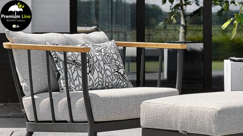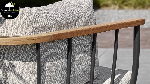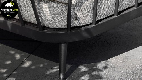 Die Applebee Condor-Lounge hat ein elegantes, robustes Aussehen. Das Grundmaterial ist matt schwarz pulverbeschichtetes Aluminium. Die BEE WETT®-Kissen haben eine grobe Gewebestruktur, aber einen weichen Griff. Die schönen Rundungen im Rücken und die Verwendung von natürlichem Teakholz in den Geländern verleihen dem Condor einen angenehmen Hauch von natürlicher Wärme.