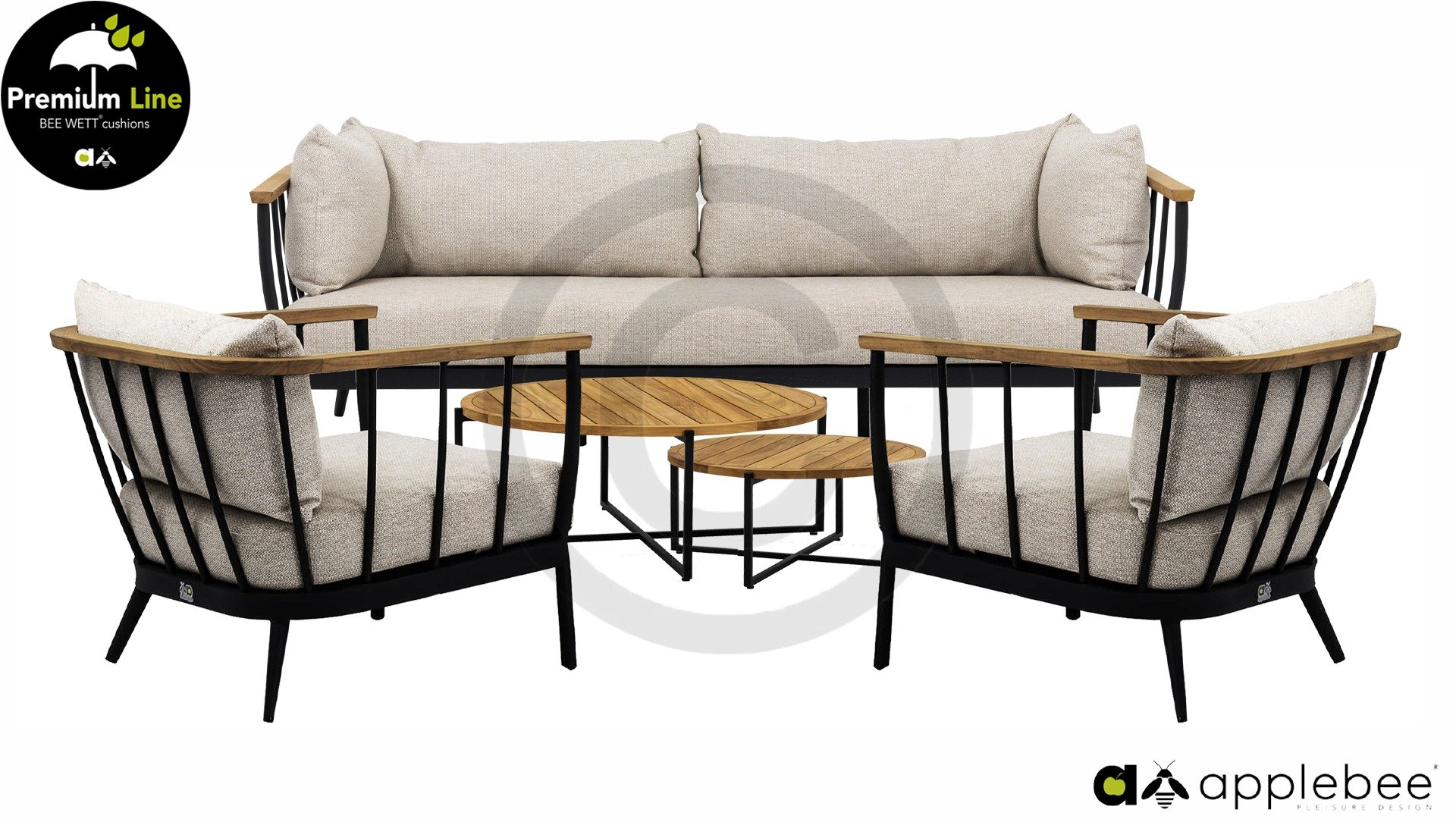 Die Condor-Lounge hat ein elegantes, robustes Aussehen. Das Grundmaterial ist matt schwarz pulverbeschichtetes Aluminium. Die BEE WETT®-Kissen haben eine grobe Gewebestruktur, aber einen weichen Griff. Die schönen Rundungen im Rücken und die Verwendung von natürlichem Teakholz in den Geländern verleihen dem Condor einen angenehmen Hauch von natürlicher Wärme
