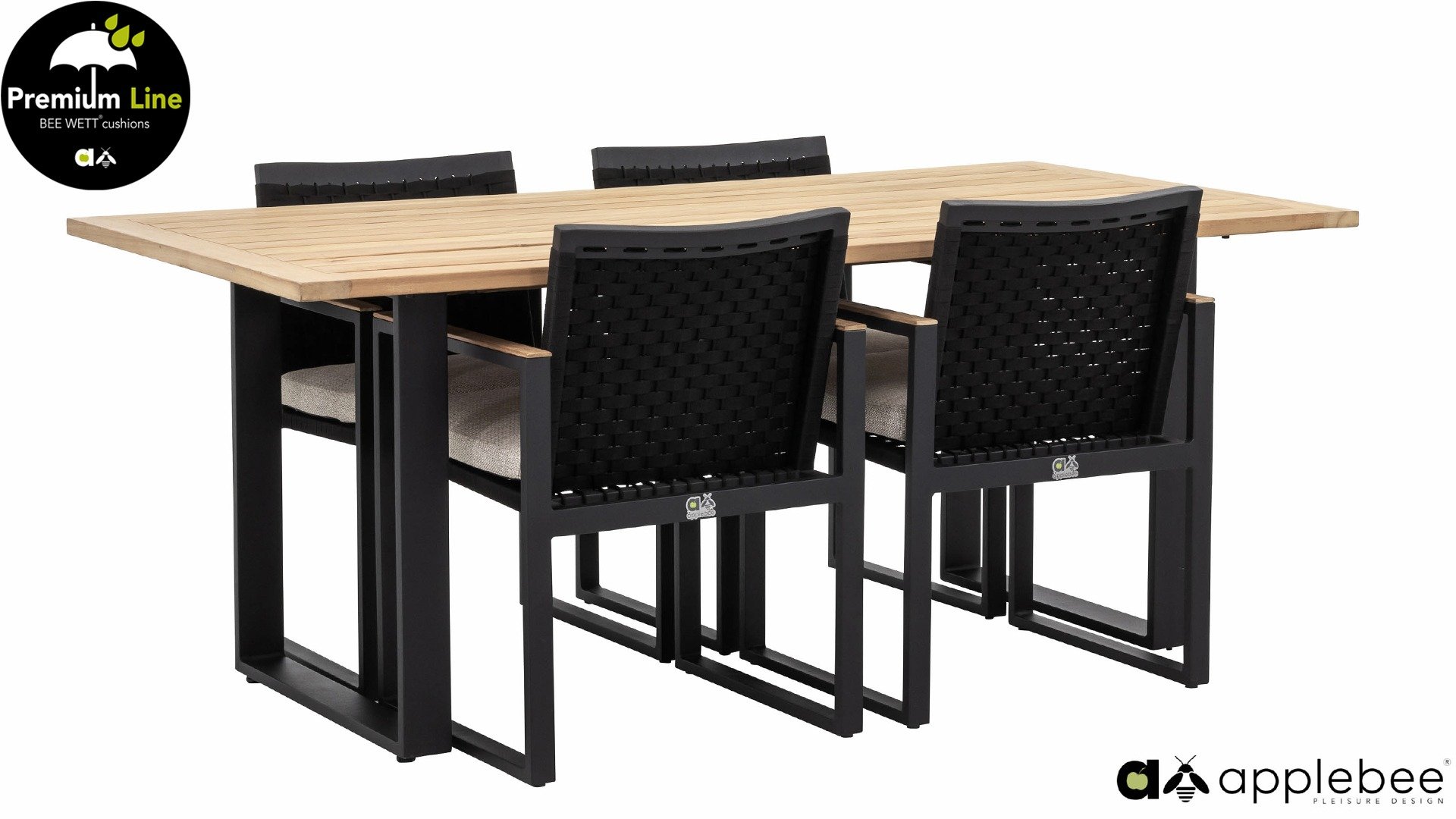 Der Applebee Dominica Esszimmerstuhl besteht aus mattschwarz pulverbeschichtetem Aluminium. Der Rahmen hat einen soliden schwarzen Gurt in der Rückenlehne und im Sitz. Das leichte Sitzkissen und das Teak-Detail in der Armlehne sorgen für Kontrast und Lebendigkeit. Das Gestell sowohl des Tisches als auch der Stühle besteht aus mattschwarzem Aluminium. Um die Applebee Dominica-Kollektion zu vervollständigen, wurde der Rückenlehne und dem Sitz auch ein geflochtener schwarzer Gürtel hinzugefügt. Wir nennen dieses Geflecht „Belt & Rope“.