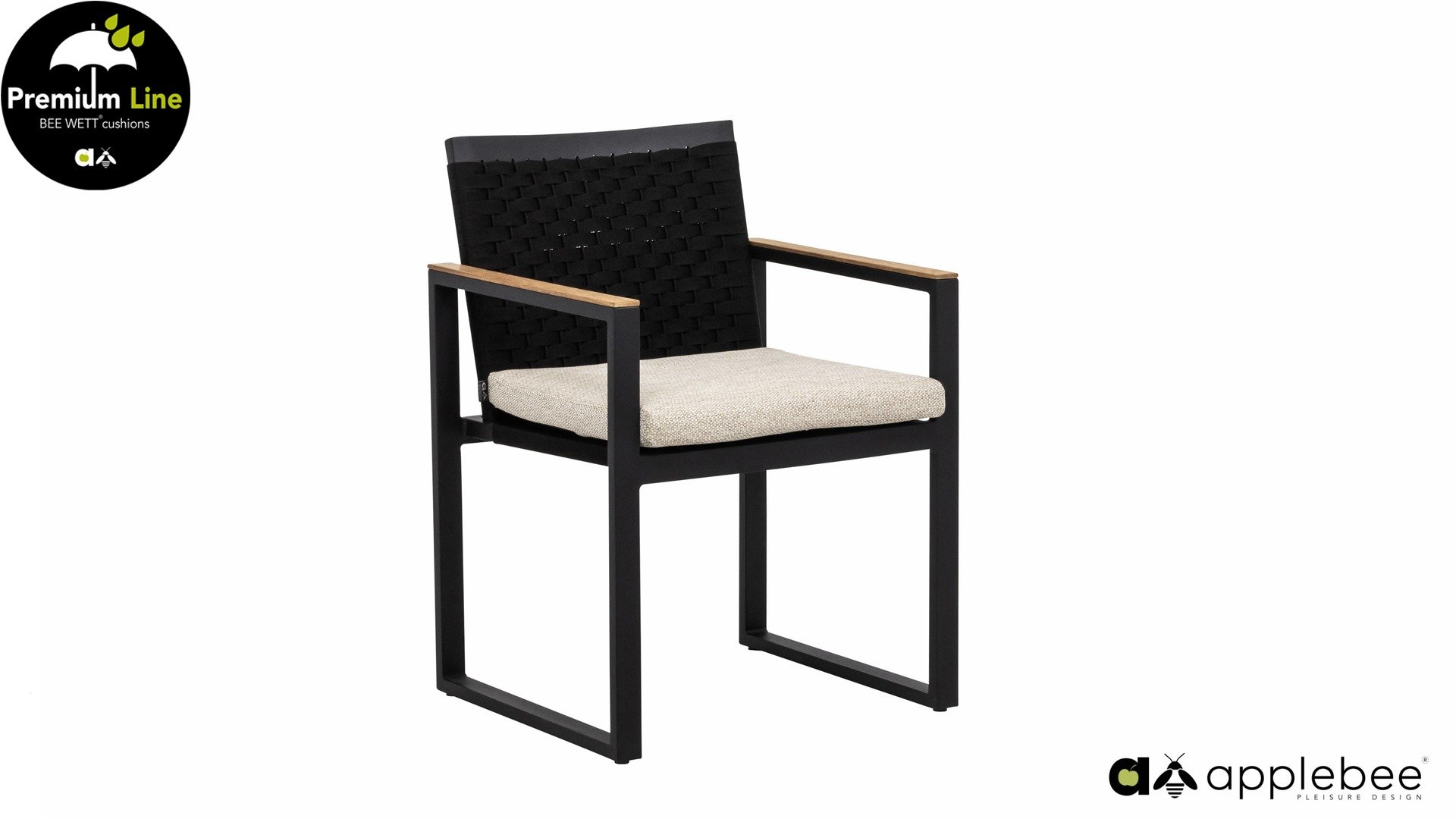 Der Applebee Dominica Esszimmerstuhl besteht aus mattschwarz pulverbeschichtetem Aluminium. Der Rahmen hat einen soliden schwarzen Gurt in der Rückenlehne und im Sitz. Das leichte Sitzkissen und das Teak-Detail in der Armlehne sorgen für Kontrast und Lebendigkeit. Das Gestell sowohl des Tisches als auch der Stühle besteht aus mattschwarzem Aluminium. Um die Applebee Dominica-Kollektion zu vervollständigen, wurde der Rückenlehne und dem Sitz auch ein geflochtener schwarzer Gürtel hinzugefügt. Wir nennen dieses Geflecht „Belt & Rope“.