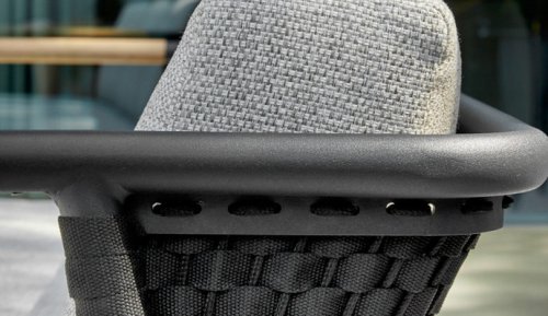 Die eleganten Linien lassen dieses Applebee Elle Lounge-Set schlank aussehen, bieten aber dennoch eine Fülle von Sitzmöglichkeiten. Der runde, mattschwarze Aluminiumrohrrahmen wechselt sich mit einer Armlehne aus natürlichem Teakholz ab. Die Rückenlehne weist eine einteilige, geflochtene, schwarz gefärbte Glocke auf, die an den Ecken sozusagen das Rückenkissen umgreift.
