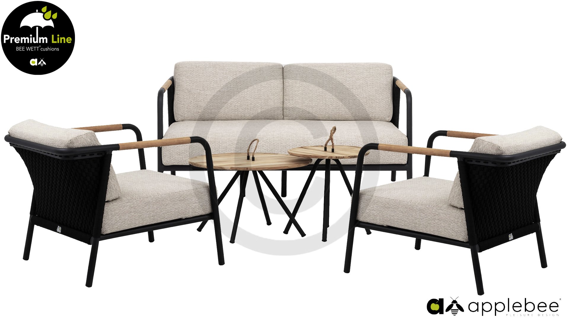 Die eleganten Linien lassen dieses Applebee Elle Belt Lounge-Set schlank aussehen, bieten aber dennoch eine Fülle von Sitzmöglichkeiten. Der runde, mattschwarze Aluminiumrohrrahmen wechselt sich mit einer Armlehne aus natürlichem Teakholz ab. Die Rückenlehne weist eine einteilige, geflochtene, schwarz gefärbte Glocke auf, die an den Ecken sozusagen das Rückenkissen umgreift.