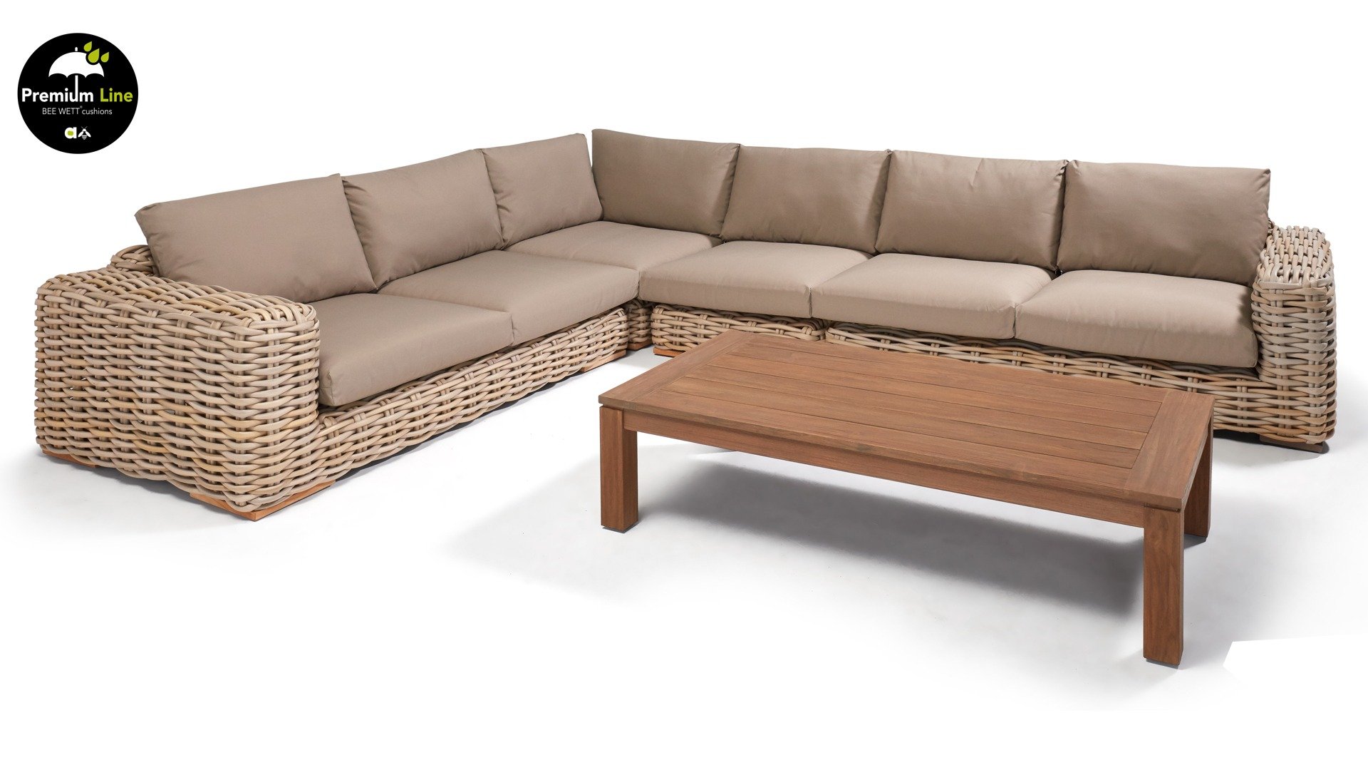 Alles ist großartig und überzeugend in diesem FFF Lounge-Set von Applebee; der Sitz ist nicht weniger als einen Meter tief und der Flechtfaden 20 mm dick. Die extra dicken Kissen sind mit unserer Bee Wett®-Technologie ausgestattet, die dafür sorgt, dass die Kissen nach einer starken Dusche schnell trocknen.