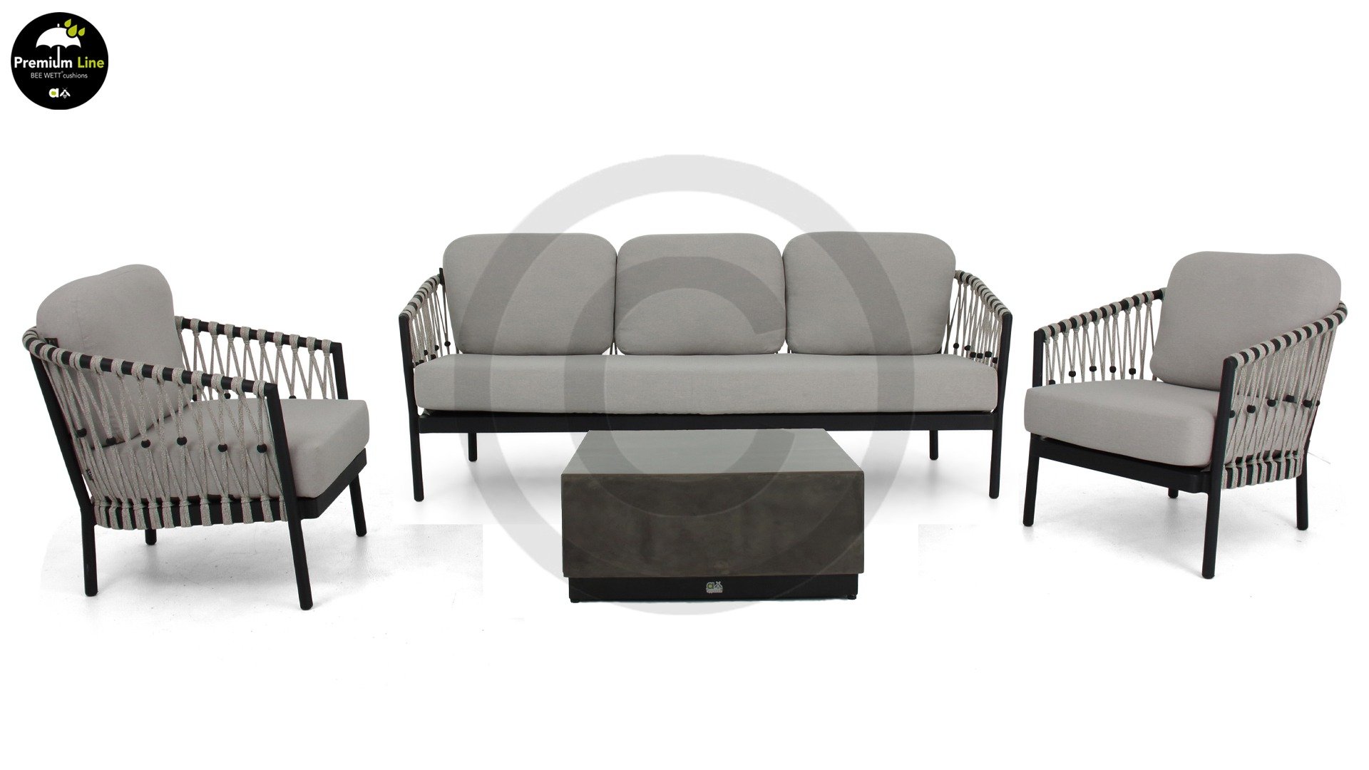 Das Menton Lounge Set von Applebee ist auf besondere Weise gewebt. Der gemischte Draht (Rope) ist sehr stark. Wo sich die Drähte kreuzen, ist eine schöne schwarze „Perle“. Dieser Applebee Crete Couchtisch sieht aus wie ein Betonblock! Aber weil es aus Leichtbeton hergestellt ist, ist es leicht.