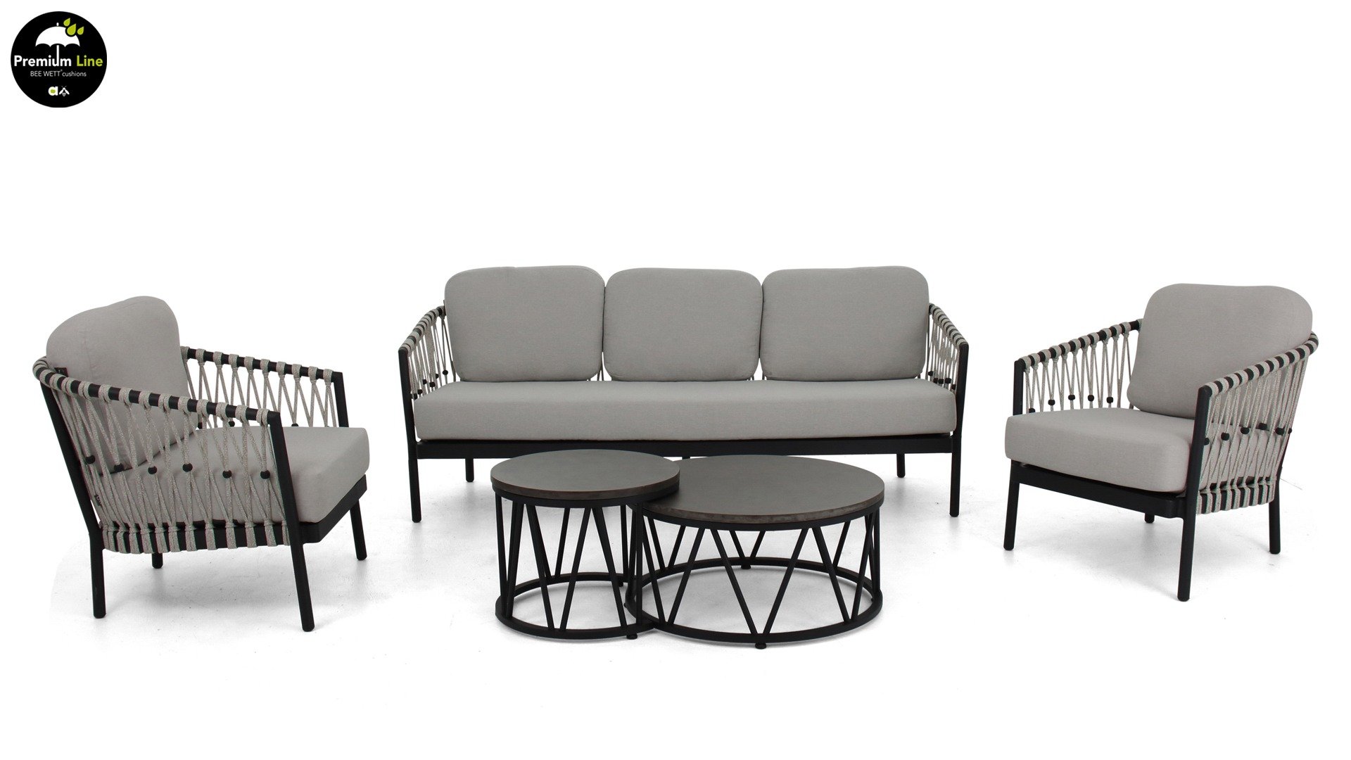 Das Menton Lounge Set von Applebee ist auf besondere Weise gewebt. Der gemischte Draht (Rope) ist sehr stark. Wo sich die Drähte kreuzen, ist eine schöne schwarze „Perle“. Das Flechtmuster ist auf dem Sockel der Applebee Menton Kaffeetische zu sehen.