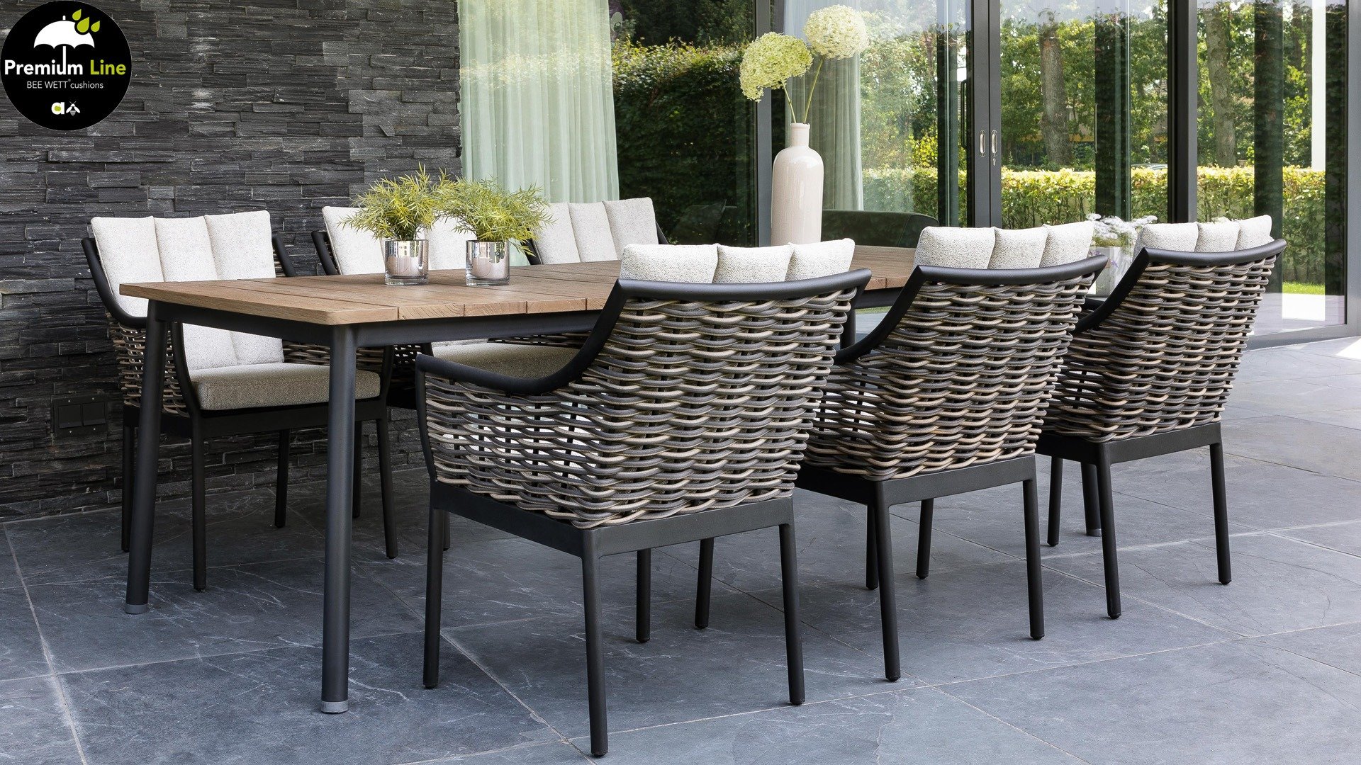 Besonders dicke Kissen in einer luxuriösen, weichen Ausführung vervollständigen das Set. In der Premium-Ausführung verfügen die Kissen über die Bee-Wett®- Technologie, die dafür sorgt, dass die Kissen nach starkem Regen schnell trocknen. So können Sie die Kissen also einfach draußen lassen. Die Drainage an der Unterseite des Kissens sorgt dafür, dass das Wasser die Kissen leicht verlassen kann. In dem großzügigen Format können Sie in Luxus und Komfort verschwinden. Die extrem dicke Flechtfaden erfordert eine spezielle Flechttechnik, die nur die besten Flechter meistern. Diese Handwerker flechten jeden Faden Draht einzeln mit der Hand ein. Mit dem AppleBee Esstisch Gruppe Milou holen Sie sich also echte Handwerkskunst im Haus.
