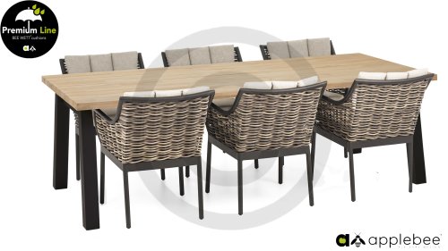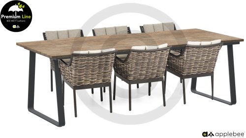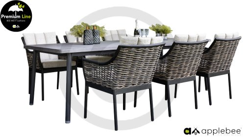 Der deutliche Erfolg von Milou Lounge erstellt eine große Nachfrage aus dem Markt für eine passende Speise Kombination. Daran hat Designer Sako gearbeitet und so entstand das Milou Dining Set. Die Milou-Kollektion ist an der Flechtweide zu erkennen, die fast aus Weidenzweigen zu bestehen scheint. Der Esstisch dieses Sets ist mit einer Ligt Weight Concrete oder einer SVLK-Teakplatte erhältlich. So gibt es immer einen Milou, der zu Ihrer Terrasse passt! Die Kissen in diesem Gartenset sind mit BEE WETT® Technologie hergestellt und werden von einem schwarzen Aluminiumrahmen getragen. Darüber hinaus ist der Milou auch in der weißen Version erhältlich, sehen Sie sich hier das Applebee Milou White Gartenmobelset oder das Applebee Milou White Loungegruppe an!