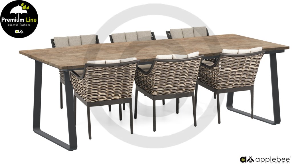 Der AppleBee Milou Gartenstuhl sieht natürlich aus, aber in der bekannten robusten Biculair® Outdoor-Qualität, die Sie von Apple Bee gewohnt sind. Umrahmt wird dieses Geflecht von einem schwarz pulverbeschichteten Rahmen mit geschwungenen Linien, wodurch das Gartenset Milou seinen schicken, modernen Look erhält. In der Premium-Linie sind die Kissen mit der Bee Wett®-Technologie ausgestattet, die dafür sorgt, dass die Kissen nach einem heftigen Regenschauer schnell trocknen. So können Sie die Kissen einfach draußen lassen. Die Drainage an der Unterseite des Kissens sorgt dafür, dass das Wasser die Kissen problemlos verlassen kann.