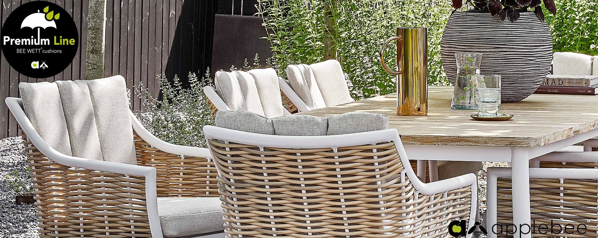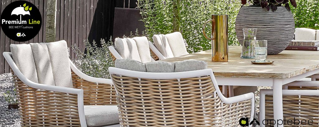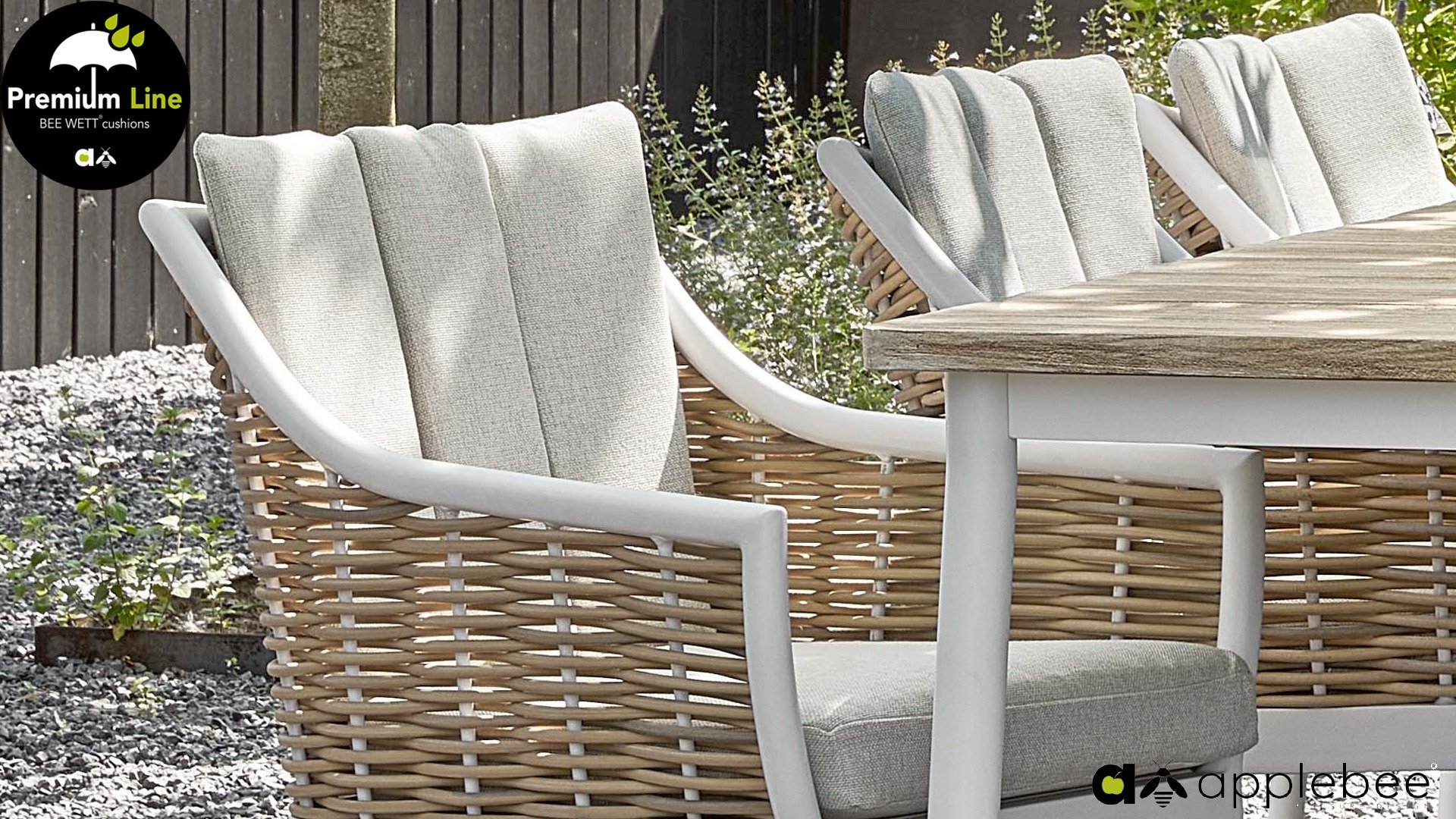 AppleBee Möbel werden hergestellt aus den besten Materialien. Das gilt ebenso auch für die Kissen und Polster. Bee Wett sind spezielle wetterfeste Kissen die natürlich draussen liegen bleiben können. Die abnehmbaren Hüllen werden aus den bestenmöglichen Stoffen hergestellt und sind alle waschbar. Der Stoff ist zusätzlich wasserabstoßend und garantiert UV-beständig. Anders als bei dem gewöhnlichen Schaum nimmt die einzigartige Bee Wett Füllung keine Feuchtigkeit mehr auf. Eine offenes Gewebe an der Unterseite der Kissen sorgt für eine perfekte Drainage. Der Vorteil, dass die Bee Wett Kissen und Polster unglaublich viel schneller trocknen als vergleichbare andere Kissen. Das Bee Wett-Kissen wird mit einem Olefin Stoff bezogen, der eine gute Beständigkeit gegen Verfaulen und Stockflecken aufweist, und darüber hinaus UV-beständig, weich, komfortabel und feuchtigkeitsabstoßend ist.