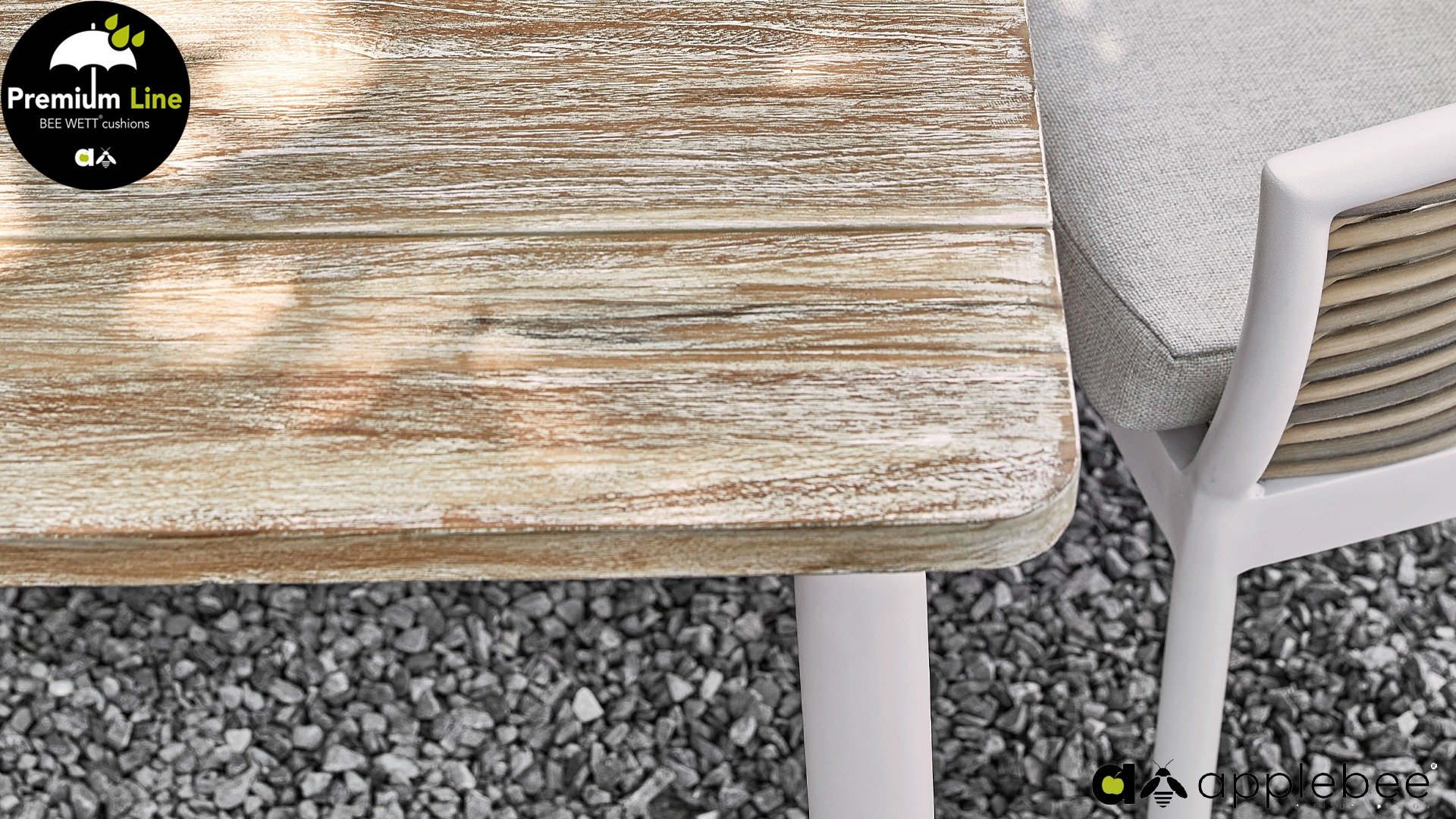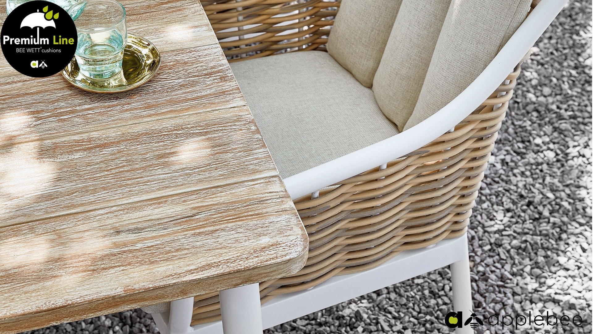 Besonders dicke Kissen in einer luxuriösen, weichen Ausführung vervollständigen das Set. In der Premium-Ausführung verfügen die Kissen über die Bee-Wett®- Technologie, die dafür sorgt, dass die Kissen nach starkem Regen schnell trocknen. So können Sie die Kissen also einfach draußen lassen. Die Drainage an der Unterseite des Kissens sorgt dafür, dass das Wasser die Kissen leicht verlassen kann. In dem großzügigen Format können Sie in Luxus und Komfort verschwinden. Die extrem dicke Flechtfaden erfordert eine spezielle Flechttechnik, die nur die besten Flechter meistern. Diese Handwerker flechten jeden Faden Draht einzeln mit der Hand ein. Mit dem AppleBee Esstisch Gruppe Milou holen Sie sich also echte Handwerkskunst im Haus. Ein gute kombination mit den Applebee Milou Weiß loungegruppe!