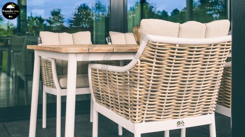 Der deutliche Erfolg von Milou Weiß Lounge erstellt eine große Nachfrage aus dem Markt für eine passende Speise Kombination. Daran hat Designer Sako gearbeitet und so entstand das Milou Dining Set. Die Milou-Kollektion ist an der Flechtweide zu erkennen, die fast aus Weidenzweigen zu bestehen scheint. Der Esstisch dieses Sets ist mit eine Teakplatte erhältlich. So gibt es immer einen Milou, der zu Ihrer Terrasse passt! Die Kissen in diesem Gartenset sind mit BEE WETT® Technologie hergestellt und werden von einem Weiße Aluminiumrahmen getragen. Auch lieferbar in Farbe Black!