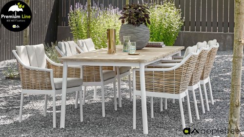 Der Mädchenname Milou bedeutet sanft und freundlich. Das gilt natürlich auch für die neue Perle in der AppleBee Kollektion. Das Geflecht des Applebee Milou hat die Ausstrahlung von Weidenruten. Natürlich anzusehen, aber in der bekannten soliden Biculair®-Qualität, die Sie von Apple Bee gewohnt sind. Umrahmt wird dieses Geflecht von einem Weiß, pulverbeschichteten Rahmen mit geschwungenen Linien, der dem Milou das schicke, moderne Aussehen verleiht. Wird der Rahmen traditionell unter dem Geflecht versteckt, hat der Designer Sako Wijma für den Milou das Flechtwerk sozusagen in dem Rahmen eingerahmt, was man eben sehen soll. Das macht die Möbel besonders spannend. Durch das freundliche Format eignet sich Milou auch für einen Balkon oder eine kleinere Terrasse. Mit AppleBee Dining Gruppe Milou Weiß wurde die Kollektion erneut um ein typisch originales Apple Bee-Designermöbel ergänzt!