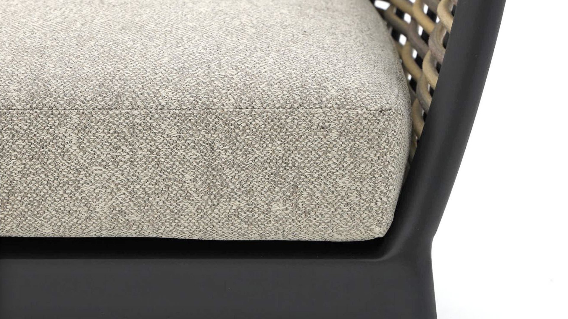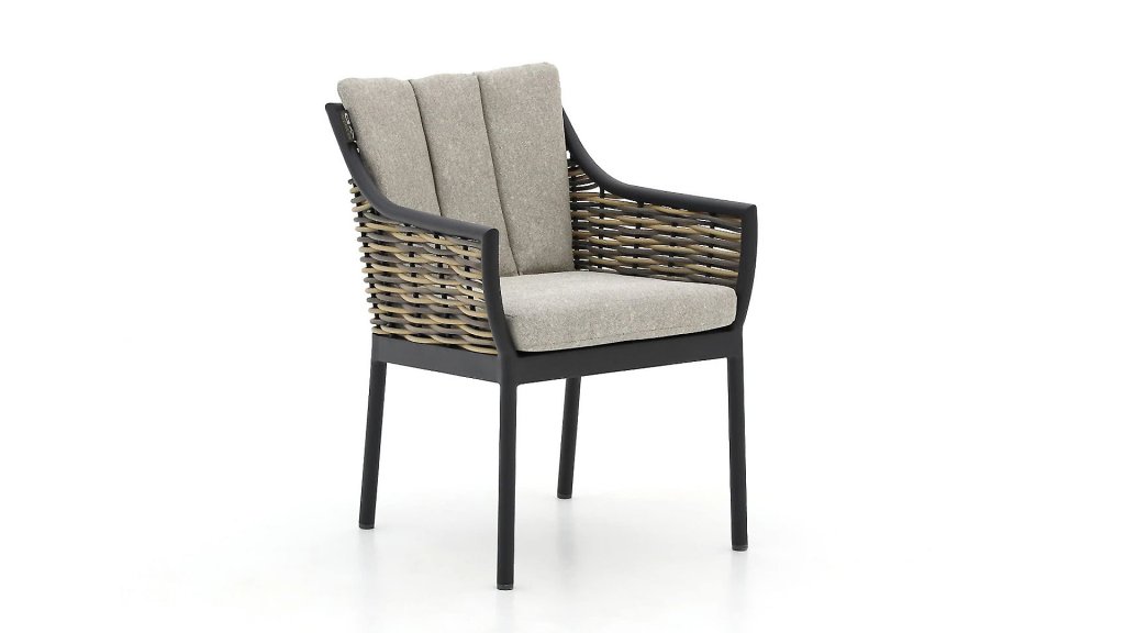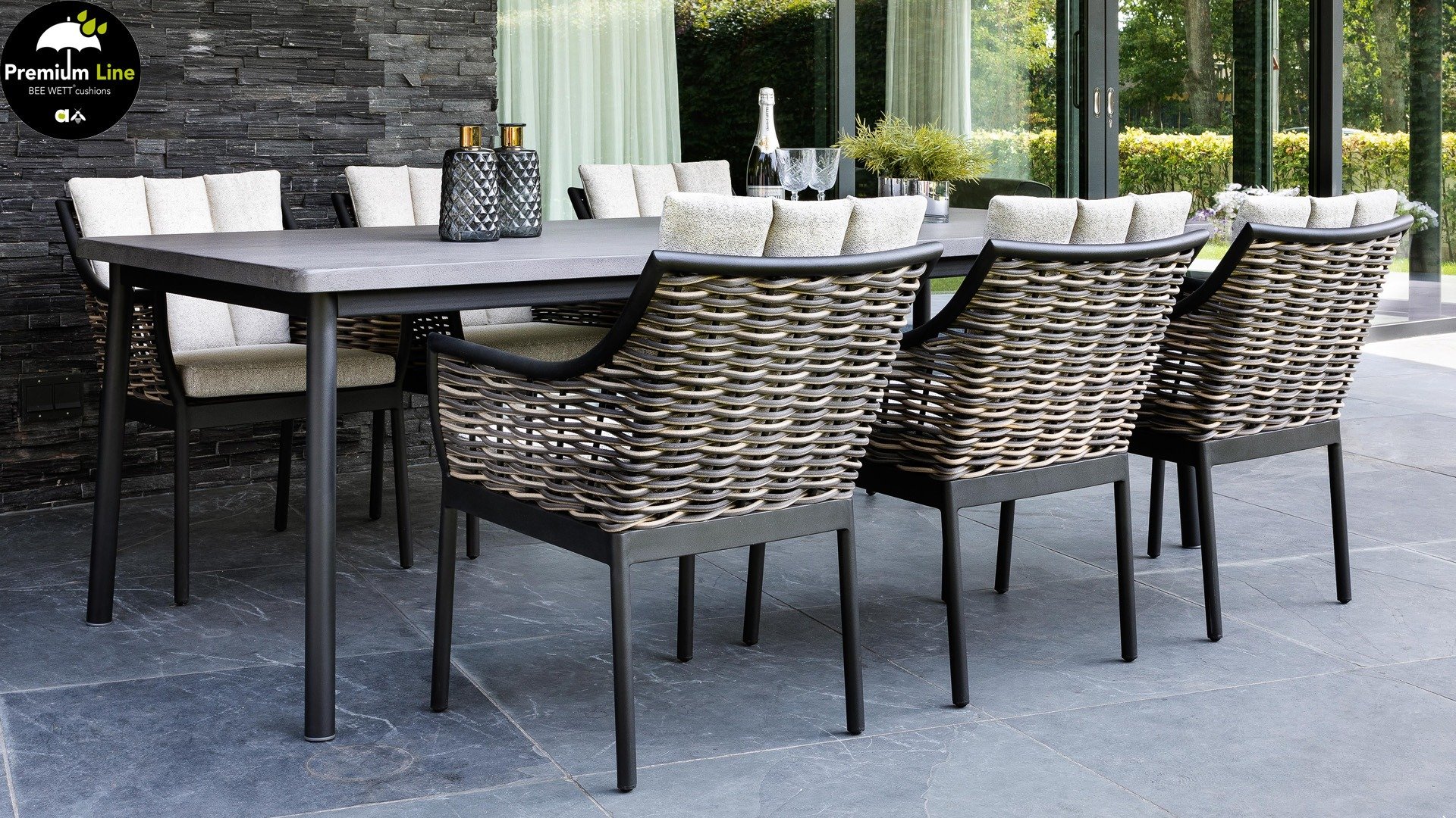 Der AppleBee Milou Gartenstuhl sieht natürlich aus, aber in der bekannten robusten Biculair® Outdoor-Qualität, die Sie von Apple Bee gewohnt sind. Umrahmt wird dieses Geflecht von einem schwarz pulverbeschichteten Rahmen mit geschwungenen Linien, wodurch das Gartenset Milou seinen schicken, modernen Look erhält. In der Premium-Linie sind die Kissen mit der Bee Wett®-Technologie ausgestattet, die dafür sorgt, dass die Kissen nach einem heftigen Regenschauer schnell trocknen. So können Sie die Kissen einfach draußen lassen. Die Drainage an der Unterseite des Kissens sorgt dafür, dass das Wasser die Kissen problemlos verlassen kann.