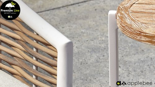 Das Geflecht des Applebee Milou Lounge hat die Ausstrahlung von Weidenruten. Natürlich anzusehen, aber in der bekannten soliden Biculair®-Qualität, die Sie von Apple Bee gewohnt sind. Dieses Mal in einem neuen, frischen Look, wo die fast strohfarbene Geflecht von einem weißen, pulverbeschichteten Rahmen mit geschwungenen Linien, der dem Milou das schicke, moderne Aussehen verleiht.
