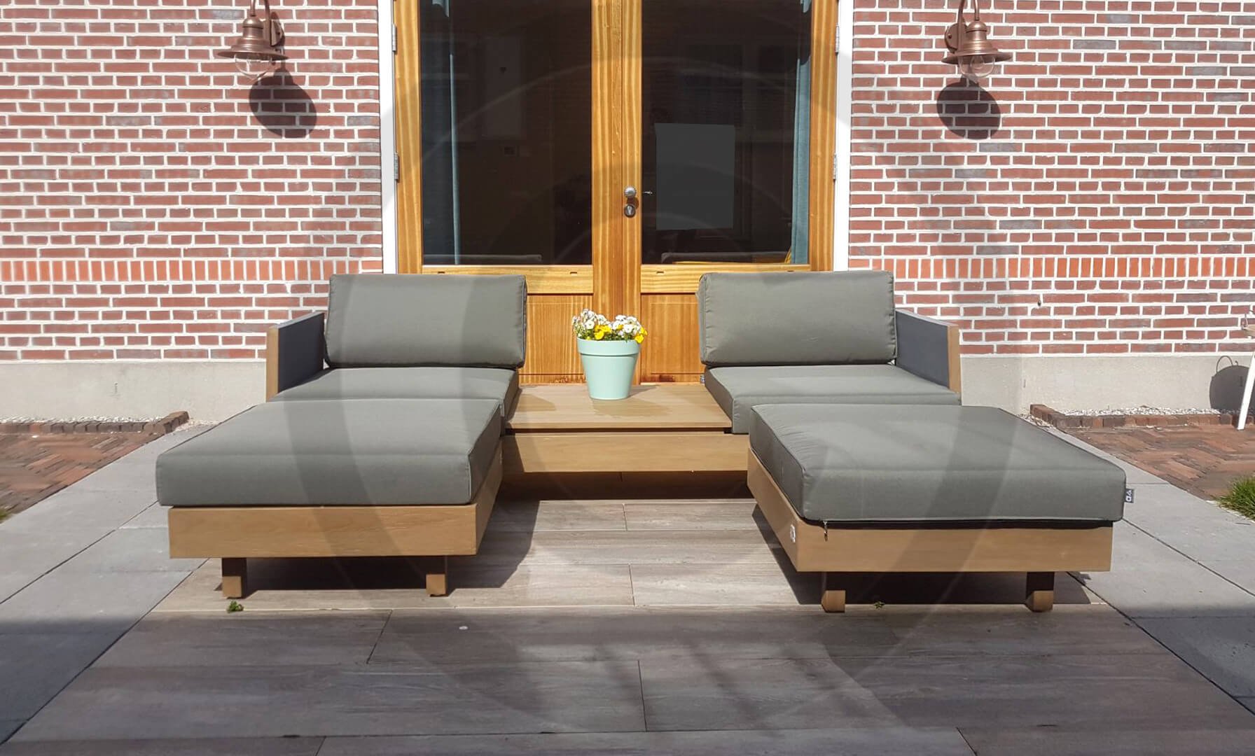 Das Loungeset besteht aus extrem starken Teakholz, das mit einem sogenannten "Antique-Finish" bearbeitet wurde. Dies verleiht Ihrem Möbel einen warmen und einzigartigen Look. Alle Kissen verfügen über einen ausgezeichneten Sitzkomfort. Außerdem sind die Sitz- und Rückenkissen mit der Bee Wett Technologie versehen, die dafür sorgt, dass der Schaum keine Feuchtigkeit aufnimmt. Das offene Gewebe an der Unterseite des Kissens sorgt zudem für eine perfekte Ableitung der Feuchtigkeit. Die Feuchtigkeit läuft durch das Kissen und bleibt dort nicht hängen. Hierdurch sind Ihre Bee Wett Kissen viel schneller trocken und vor Schimmeln und Schmutz geschützt. Applebee Module X lounge ist auch in der Farbe Coastal Lieferbar!