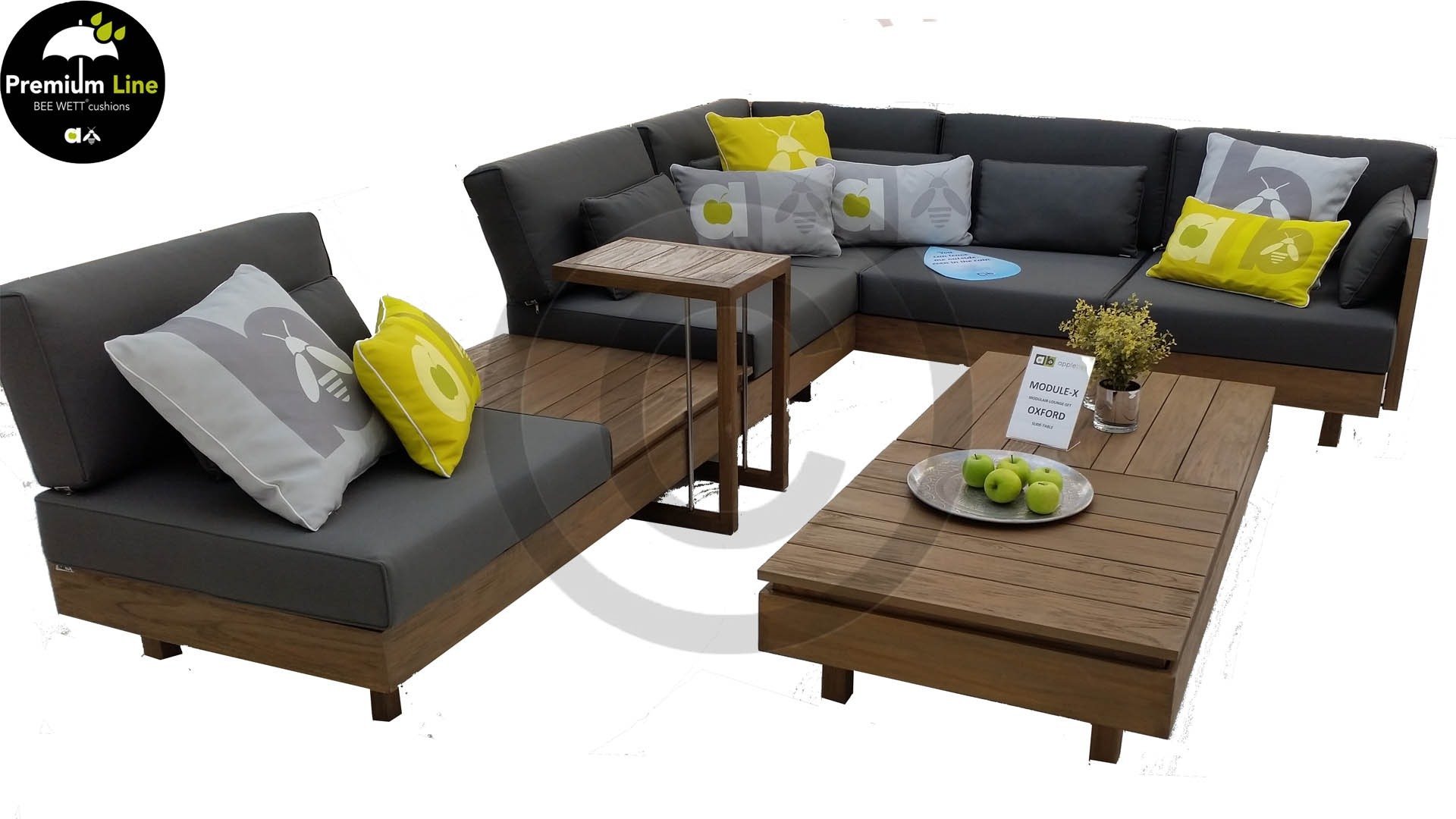 Das Applebee Lounge-Set Module X besteht aus extrem starkem Teakholz, das mit einem sogenannten neuen Antique Finish versehen ist, das Ihren Möbeln ein robustus Aussehen verleiht. Die Sitz- und Rückenkissen in dieser Reihe ist mit der BEE WETT®-Technologie, die perfekte Ableitung von Feuchtigkeit gewährleistet.
