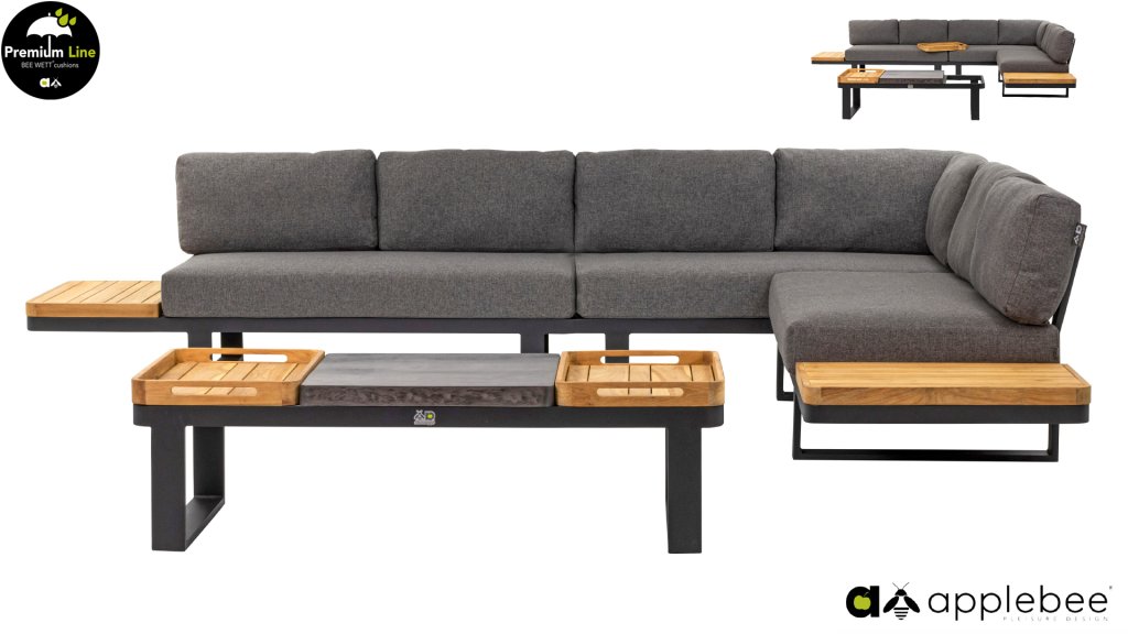 Die modulare Anordnung dieses Applebee Mura Lounge Sets ist nicht nur funktional, sondern der Couchtisch ist auch praktisch gestaltet. Der Couchtisch hat in der Mitte eine Tischplatte aus Leichtbeton und wird an den Seiten durch zwei abnehmbare Teakholzschalen ergänzt. Superpraktisch zum Beispiel zum Servieren von Speisen und Getränken! Oder Sie können das Tablett mit den Getränken auf die Bank stellen, damit Sie in Ihrer Position bleiben können.