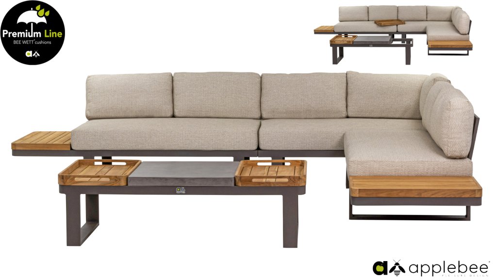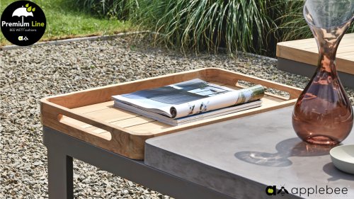Die modulare Anordnung dieses Applebee Mura Lounge Sets ist nicht nur funktional, sondern der Couchtisch ist auch praktisch gestaltet. Der Couchtisch hat in der Mitte eine Tischplatte aus Leichtbeton und wird an den Seiten durch zwei abnehmbare Teakholzschalen ergänzt. Superpraktisch zum Beispiel zum Servieren von Speisen und Getränken! Oder Sie können das Tablett mit den Getränken auf die Bank stellen, damit Sie in Ihrer Position bleiben können.