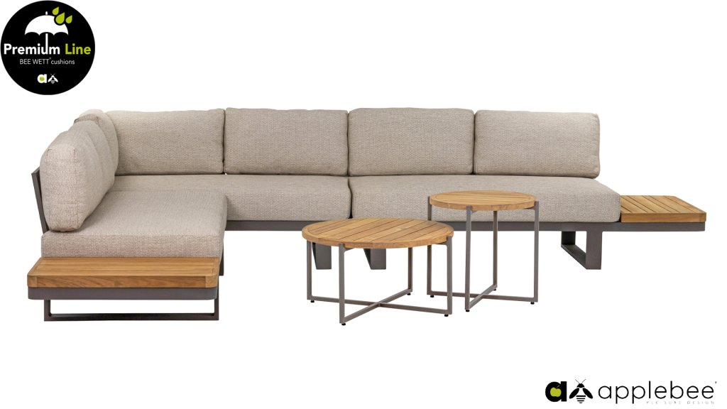 Die brandneue Applebee Mura Lounge ist eine wahre Augenweide. Dieses Loungeset sieht nicht nur originell aus, es ist auch eine funktionelle Ergänzung für Ihren Garten. Die Mura Lounge lässt sich dank der verschiedenen Module ganz nach Ihrem Geschmack einrichten. Beide Sofas sind Zweisitzer, darunter ein Eckmodul und ein Sofa mit einem Teaktisch an der Seite.