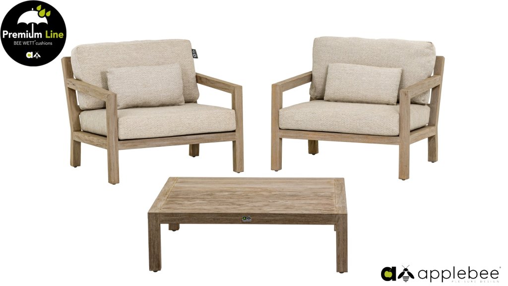 Die klaren, kantigen Linien dieses Applebee Olive Lounge-Sets sind schräg. Schieben Sie die Ottomane in den Loungesessel und genießen Sie den Komfort, den dieses Teakholz-Set zu bieten hat. Auf unseren weichen und wetterfesten Bee Wett®-Kissen werden Sie sich garantiert wohlfühlen!